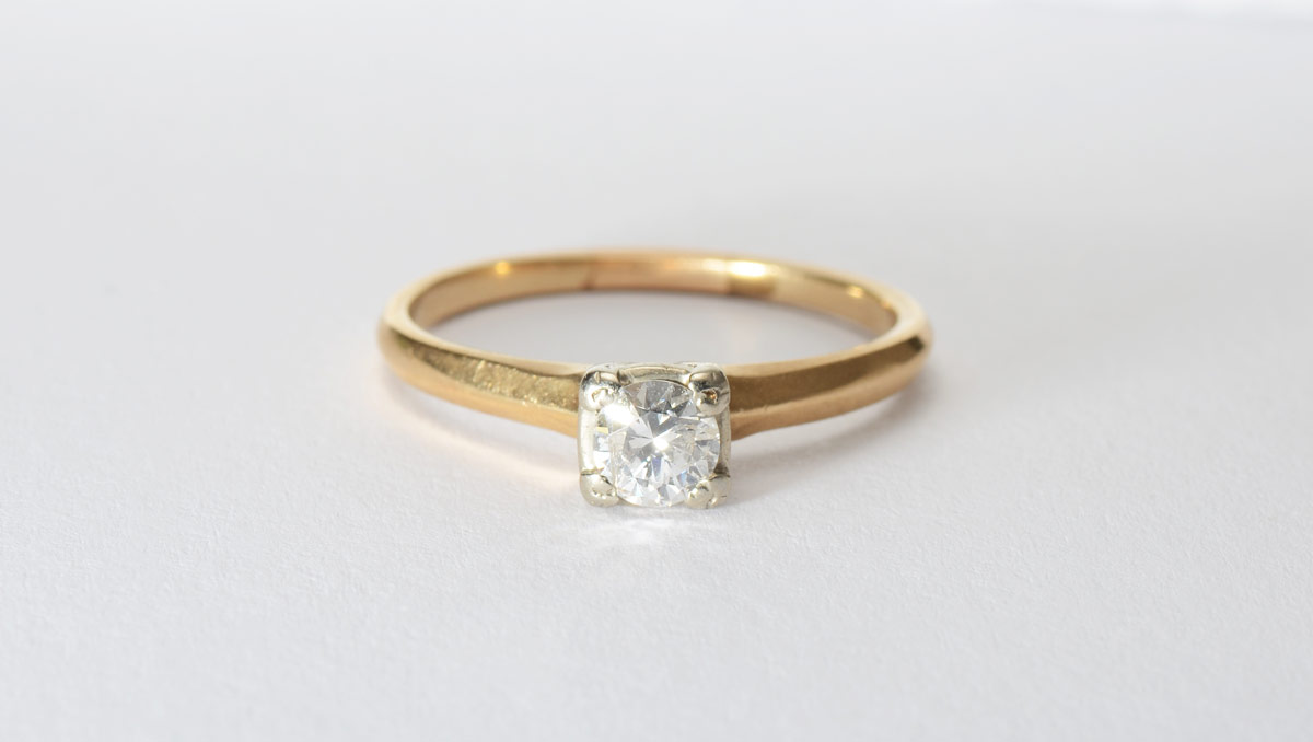 DIAMOND SOLITAIRE ENGAGEMENT RING: 14K yellow gold ring contains one round brilliant cut diamond. Weight: .36 Ct. Approx. Rated VS1 in clarity and G in color. The diamond is prong set. Weight: 2.9 grams. Size: 7