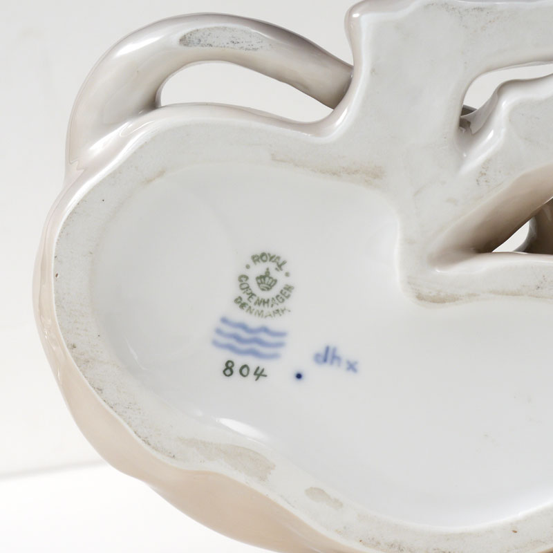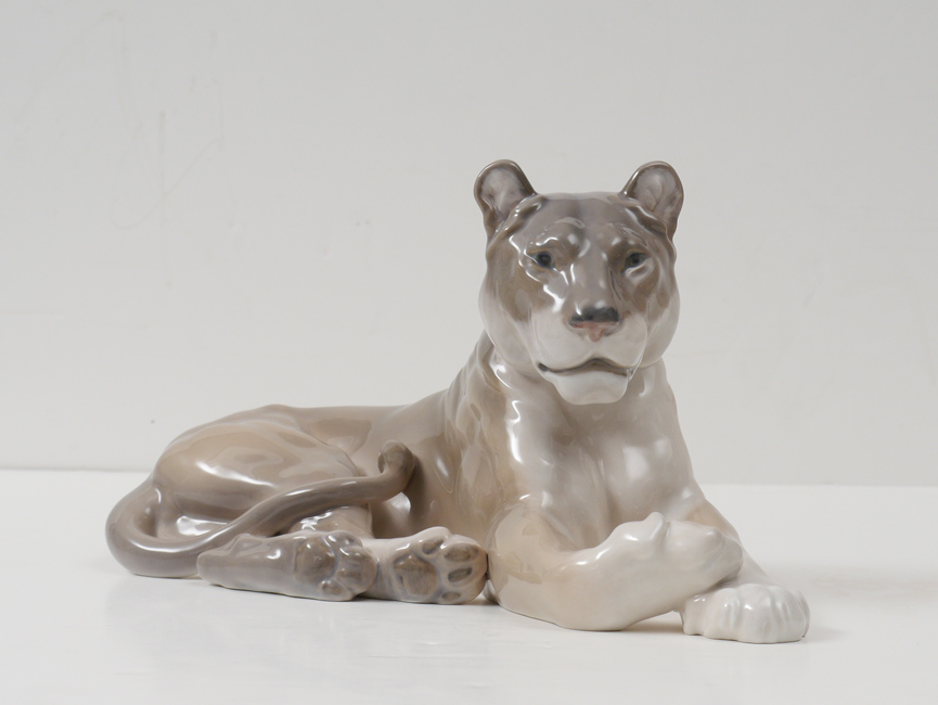 ROYAL COPENHAGEN PORCELAIN LIONESS #804: Figure of a recumbent lioness, marked with Royal Copenhagen marks on base, number 804 and dhx. Measures 6 1/2'' h. x 12'' x 6 1/4''.