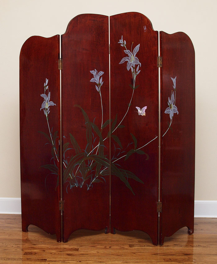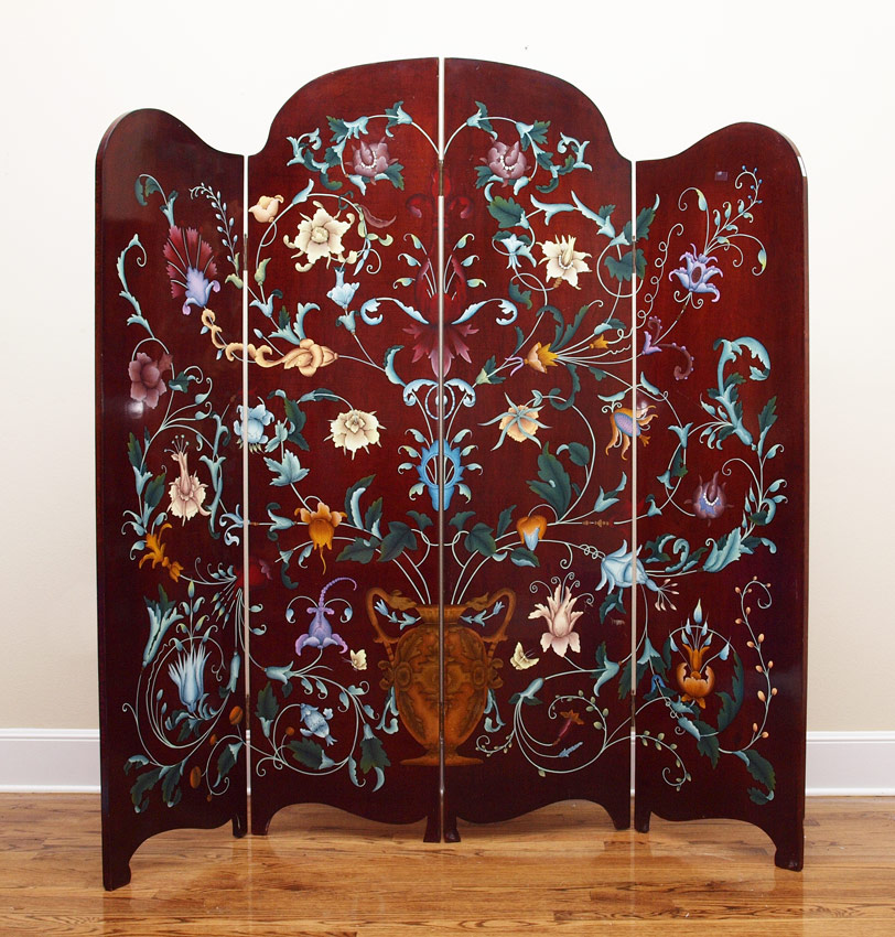 PAINT AND LACQUERED 4 PANEL SCREEN: Elaborate floral motif paint decoration one side, more subdued floral decoration verso. Shaped top and bottom, tallest panel 72'' h. x 18''.