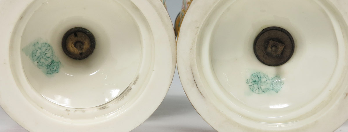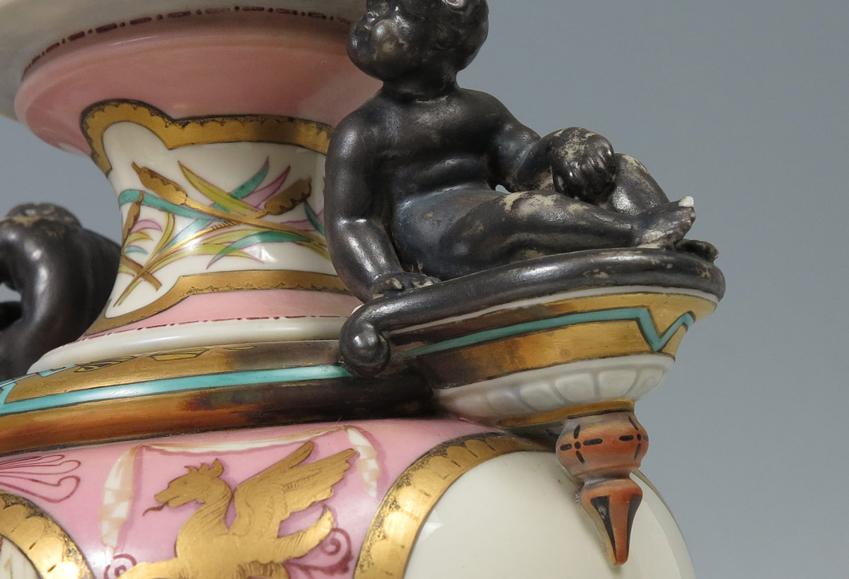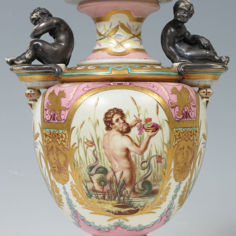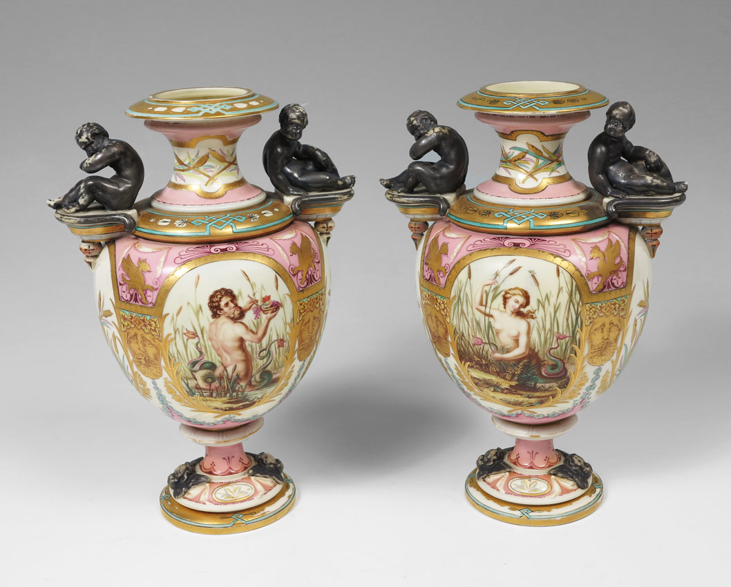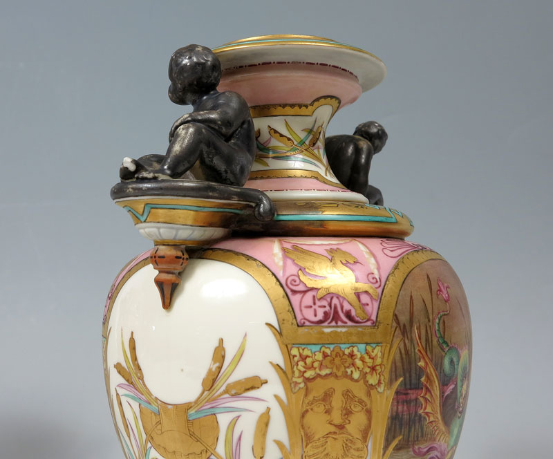 PAIR ROYAL WORCESTER PORCELAIN VASES: Rich with mystical images, bracket handles supporting full figure putti. Approx. 11'' tall. Blurred mark.