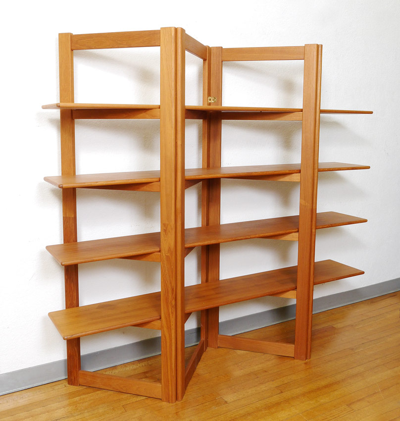 MODERN K.D. FURNITURE TEAK OPEN SHELVES: Clean mid century design, supports open or close on hinges for storage, 4 open shelves. Overall measures 67 1/2'' h. x 72'' x 16 1/2''.