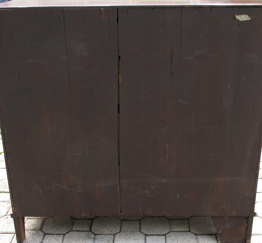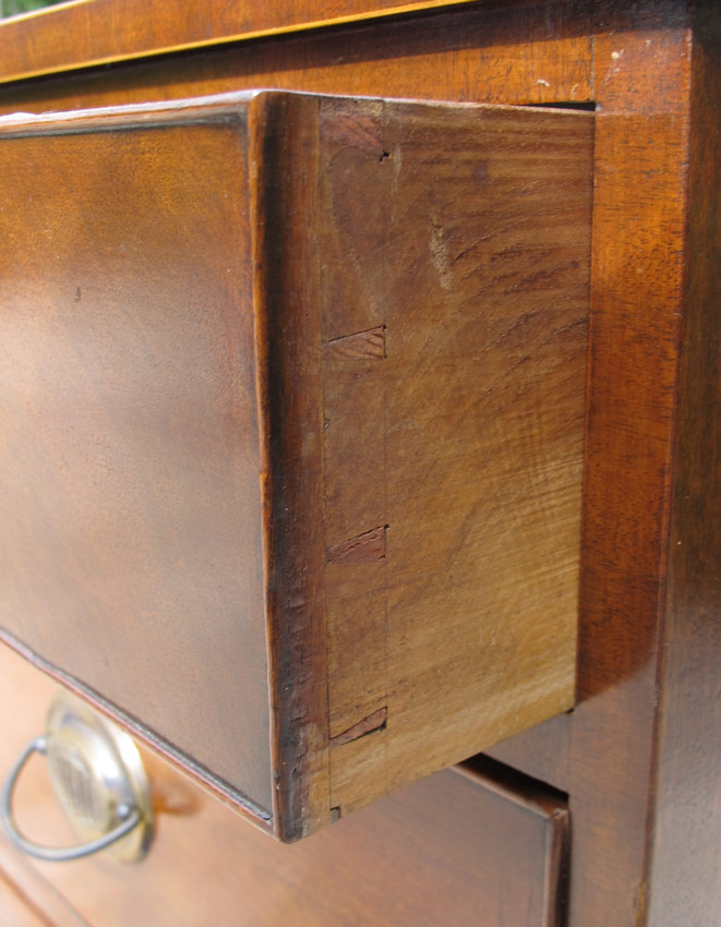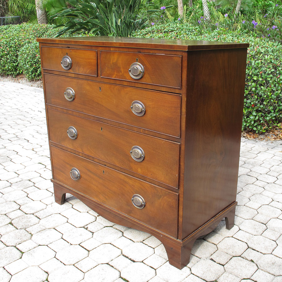 EARLY 19TH CENTURY HEPPLEWHITE CHEST: Mahogany with string inlay accents, 2 half drawers over 3 graduated full length drawers, embossed brass pulls. Shaped shirt, on 4 feet. 39 1/2'' h. x 40 1/2'' x 19 1/2''.