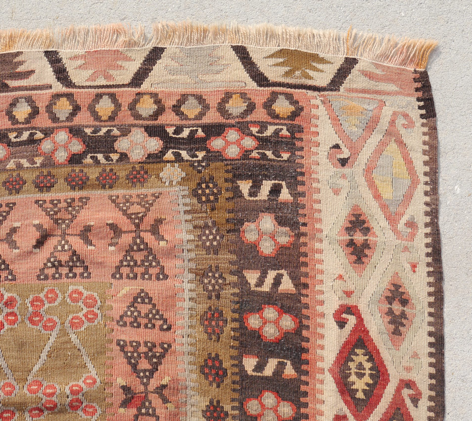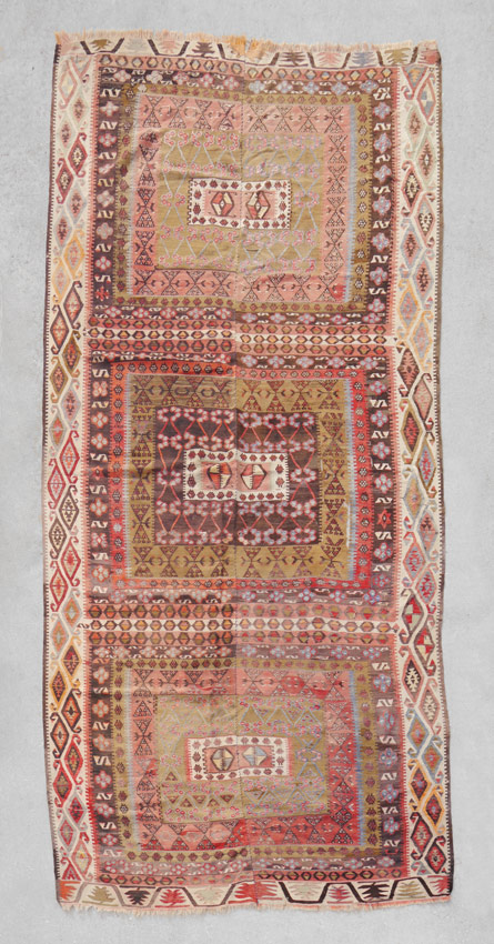 SEMI-ANTIQUE TURKISH HAND WOVEN WOOL KILIM RUG, 5' 2'' x 10' 6'': This Kilim was woven in two strips on a narrow loom and then sewn together. The sides are well matched. The design consists of three square panels of squares within squares to a small rectangular center panel. Each part has a different color background and a different design to make for an interesting looking rug.