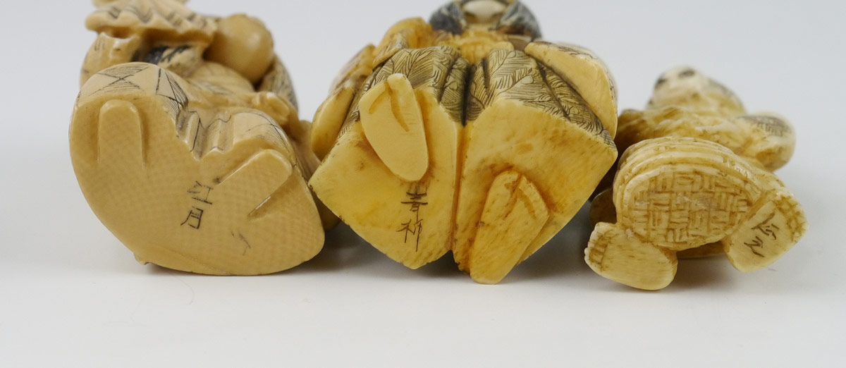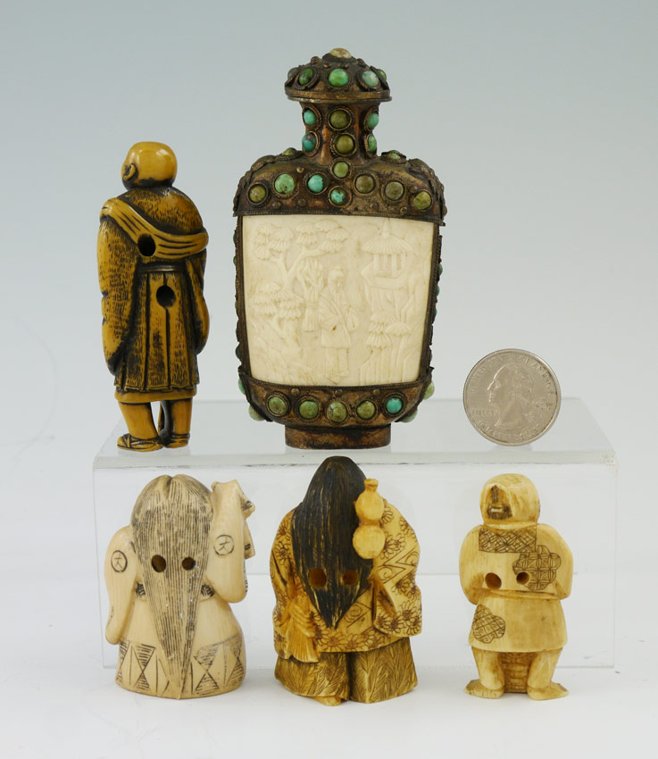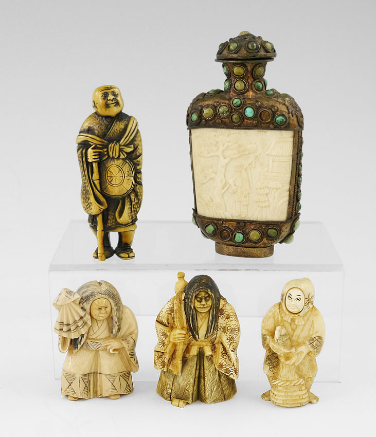 COLLECTION OF CARVED IVORY NETSUKE & CARVED JAR: 5 pieces total to include 1) Articulated face netsuke, figure holding water gourd, signed, 2 1/8''. 2) Articulated face netsuke, figure holding handkerchief, signed, 2'' h. 3) Articulated face netsuke, figure pulling fish out of basket, signed, 2'' h. 4) Mammoth ivory netsuke, elder holding bamboo staff, 3'' h. 5) Mixed metal snuff jar with carved ivory plaque inserts, stone cabochons. Original lid and spoon.