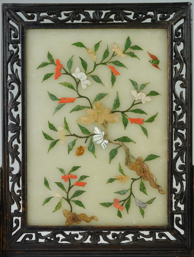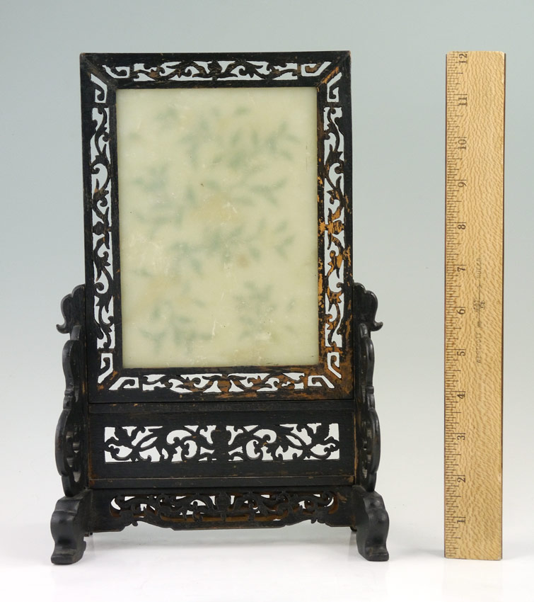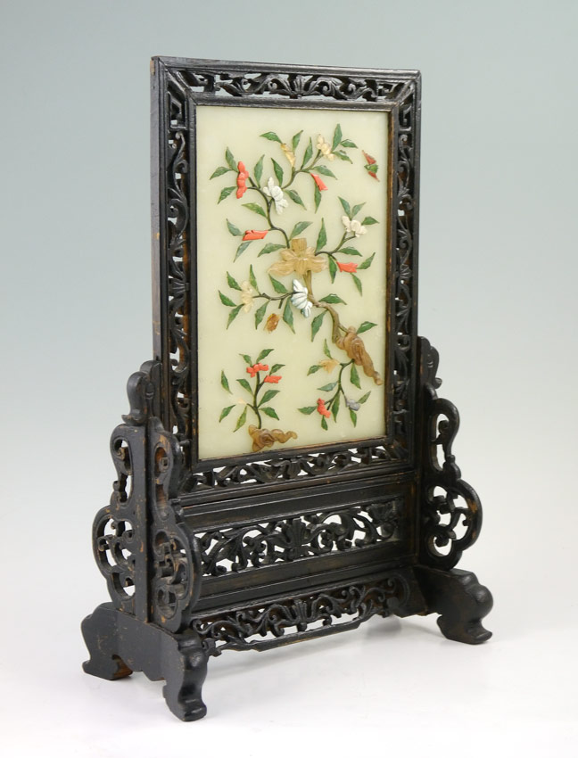 ORIENTAL JADE TABLE SCREEN: Applied floral decoration on one side, carved frame to removable panel. Pierced stand. 12 1/4'' h. x 8'' x 4''.