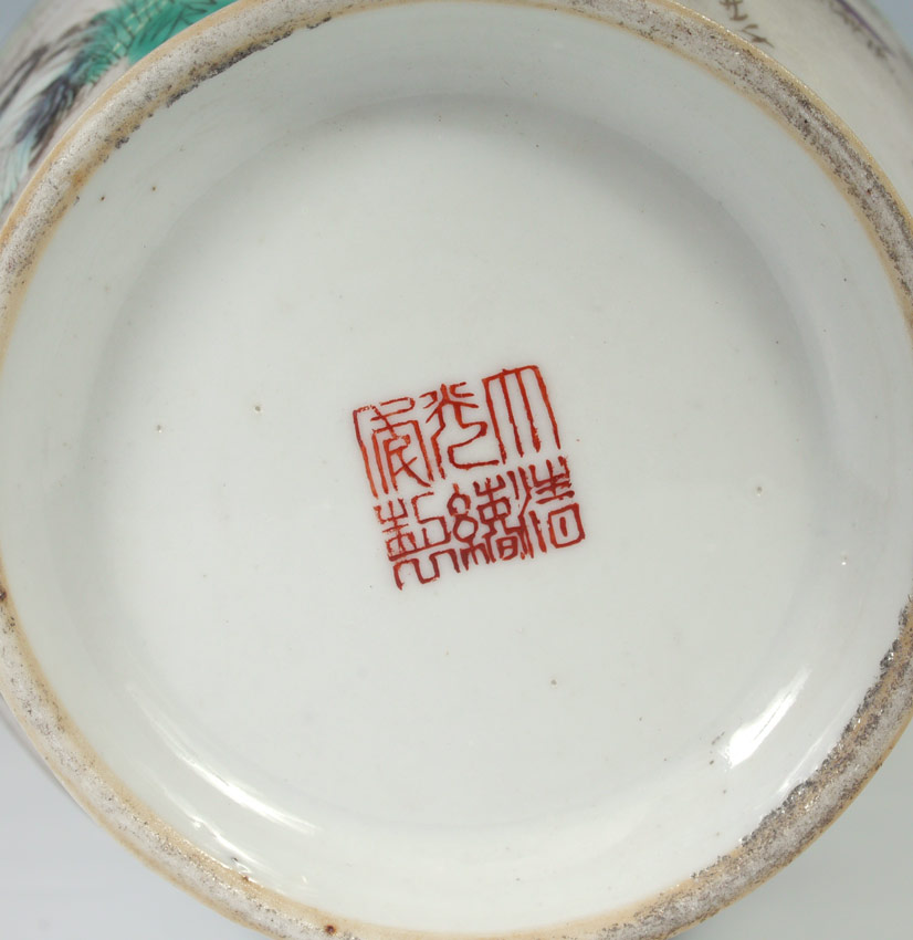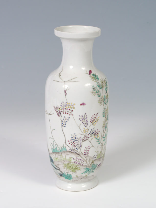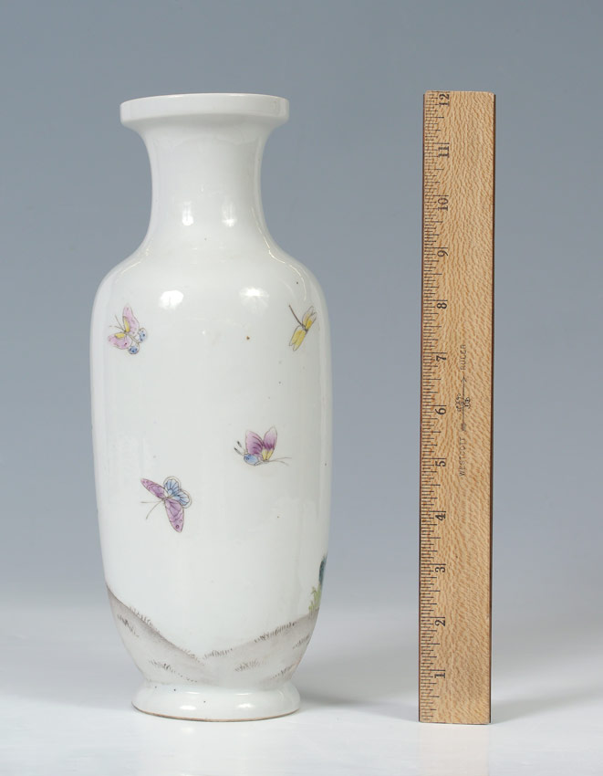 CHINESE HAND PAINTED BUTTERFLY VASE: Baluster form vase with floral, butterflies and other insect motifs, red Guangxu underglaze markings on base. 12'' h. x 4 1/2''. Actual age unknown.