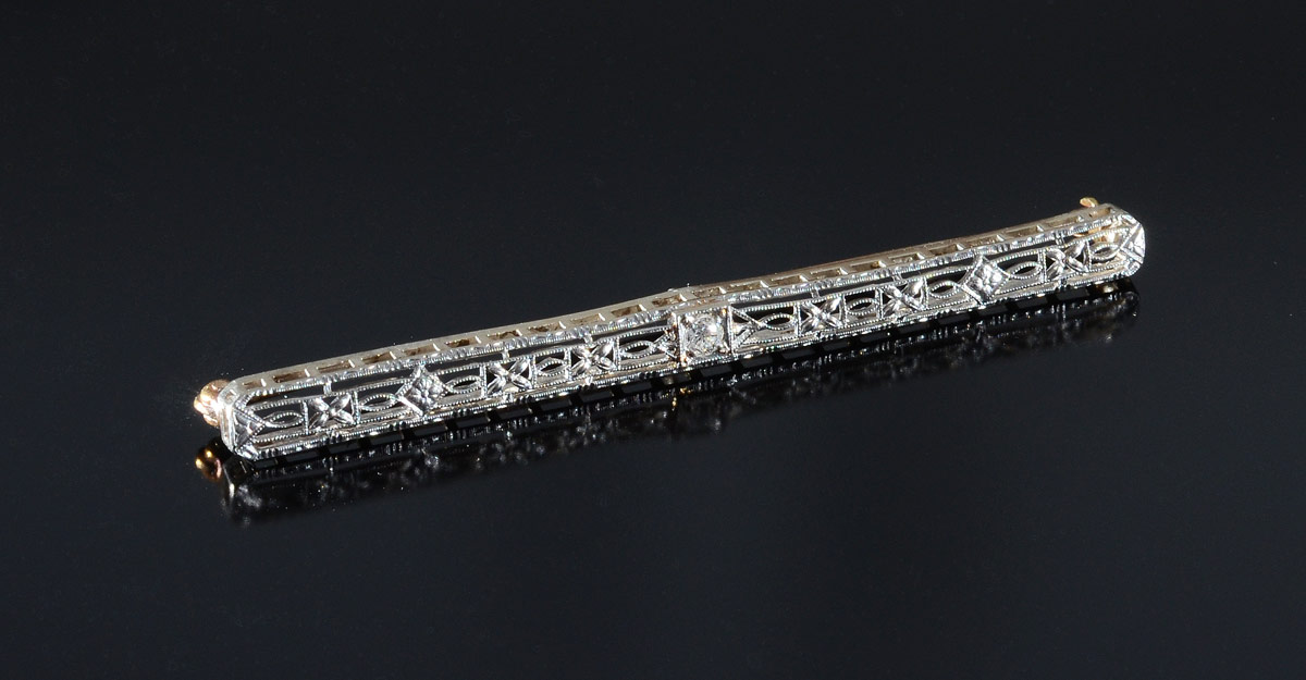 14K DIAMOND DECO BAR PIN: 14K white gold bar pin contains one round brilliant cut diamond. Weight: .07 Ct. Approx. VS in clarity and h-I in color. Filigree pin with bar pin closure. Weight: 3.8 grams.