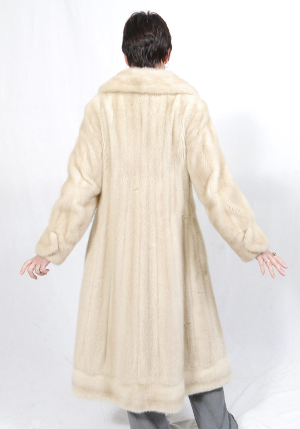 FULL LENGTH TOURMALINE MINK COAT: Light colored with beige tones, full sleeves with fitted cuff, band at the hem. Measures approx.. 49'' collar to hem, 19'' shoulder to shoulder, and 20'' shoulder to cuff.
