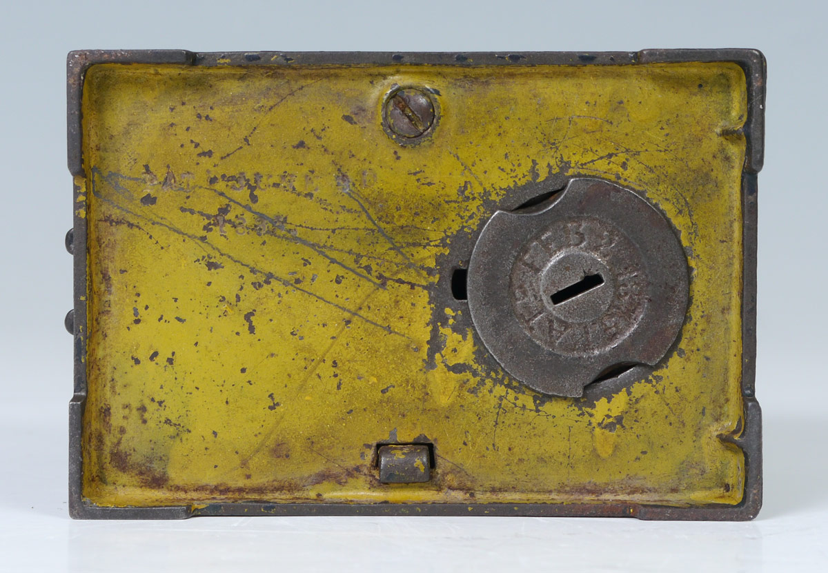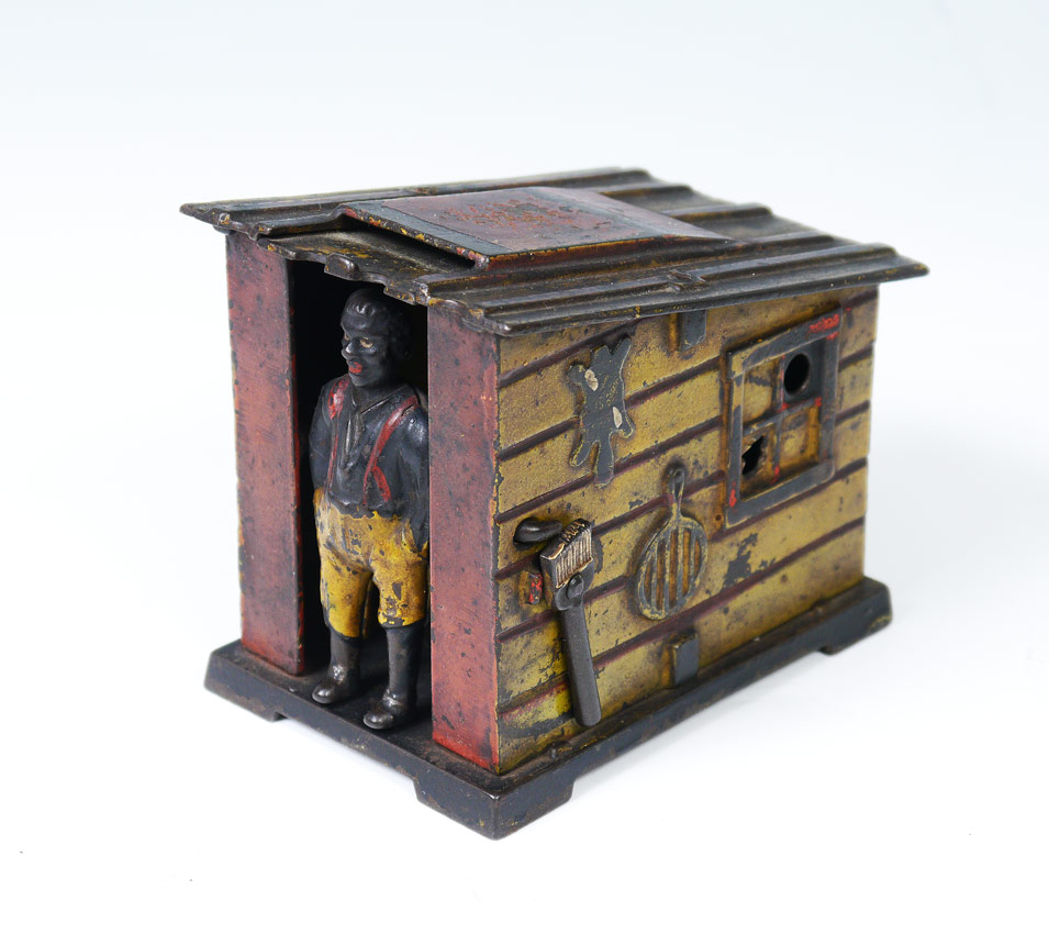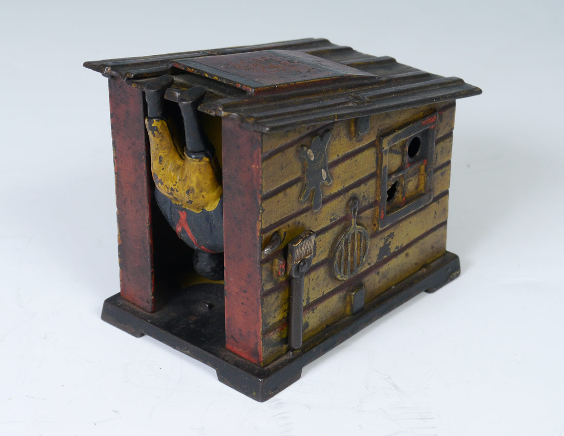 J.E. STEVENS CABIN CAST IRON MECHANICAL BANK: A turn of the broom on right hand side makes the African American at the door flip over to kick coin into slot. Yellow sides with red roof and front. 3 3/4'' h. x 3'' x 4 1/4''.