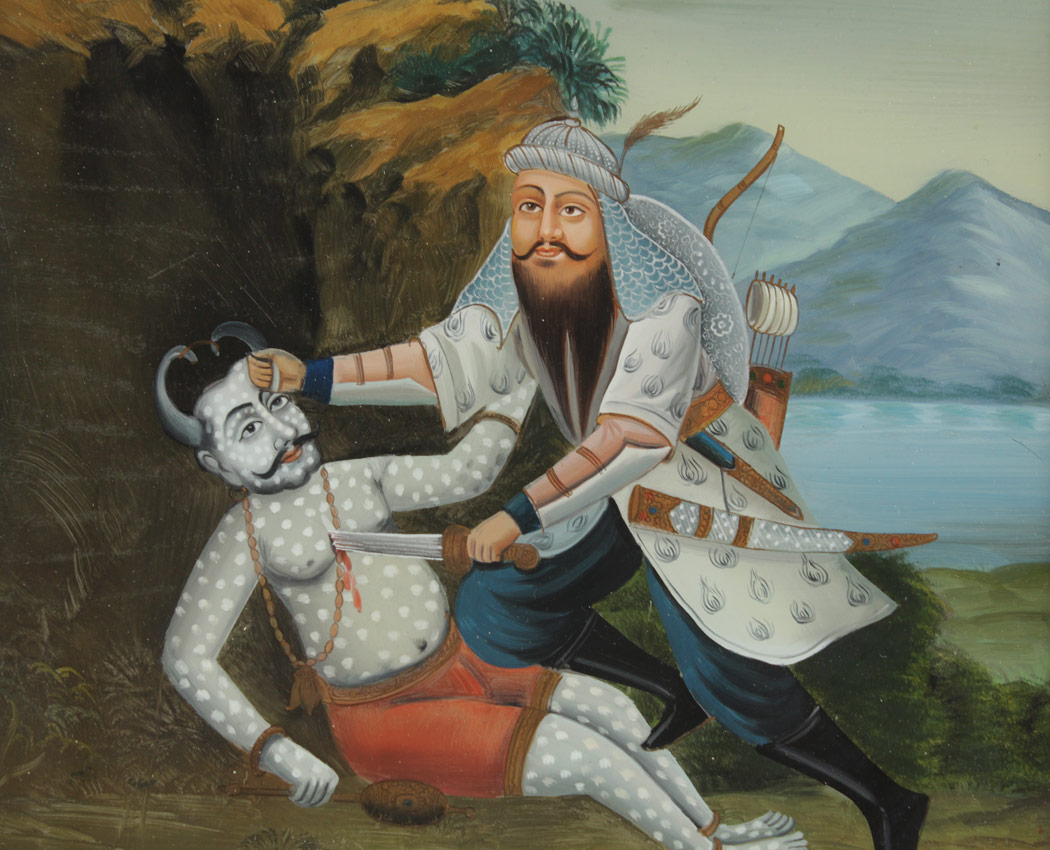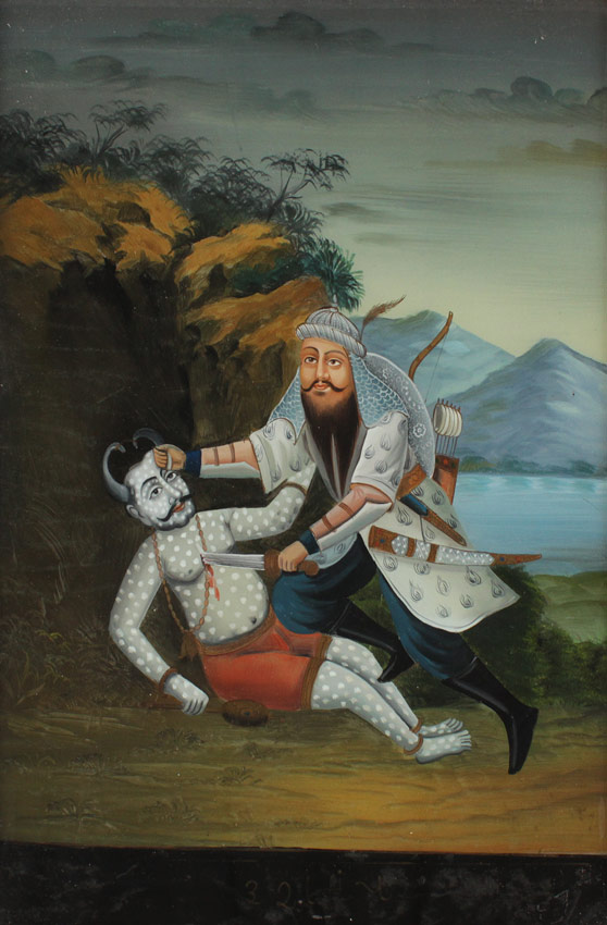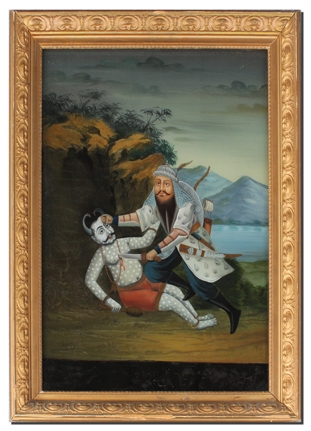 REVERSE PAINTED INDIAN PAINTING: Sight size 19'' x 13'', signed, framed 22'' x 16 1/2'', New York Gallery Label from the 50's or 60's with a price tag on it of over $3800.
