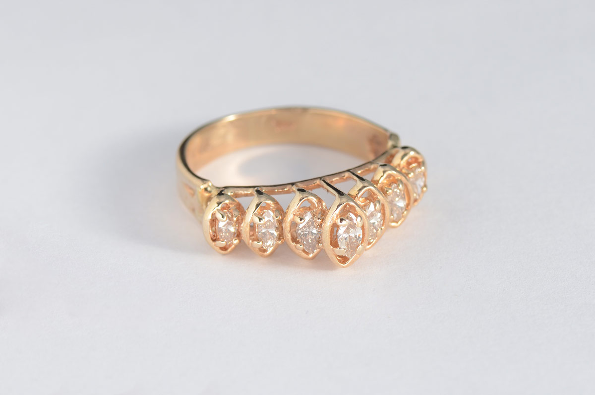 14K .33 CTW DIAMOND RING: 14K yellow gold ring contains 7 marquise brilliant cut diamonds. Weight: .33 Ct. Approx. Rated VS-SI in clarity and Top Light Brown in color. The diamonds are prong set. Weight: 4.4 grams. Size: 7
