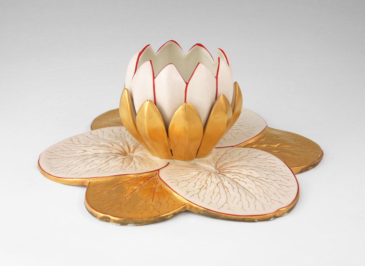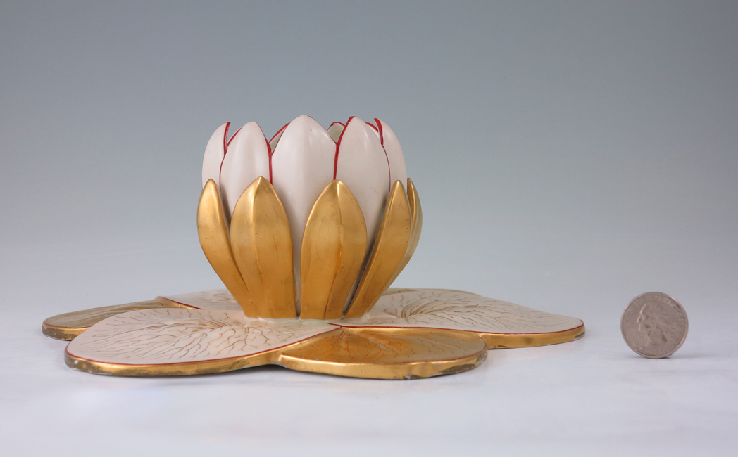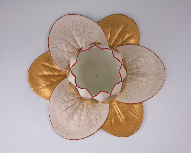 ROYAL WORCESTER LILY PAD VASE: Parcel gilt porcelain in the form of a lily pad and blooming flower. Date mark for 1882. Measures 9 1/2'' dia. x 4 1/2'' tall.