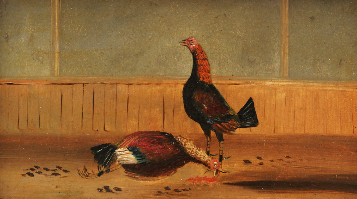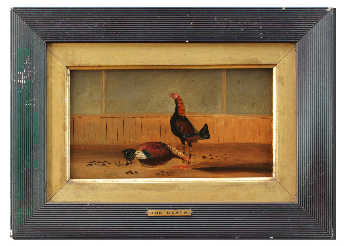 19TH CENTURY COCK FIGHT PAINTING: ''The Death'', Oil/Board, no visible signature, 5 1/2'' x 9 1/2'', encased in period ebonized frame with gilded liner with wear, 10'' x 14''.