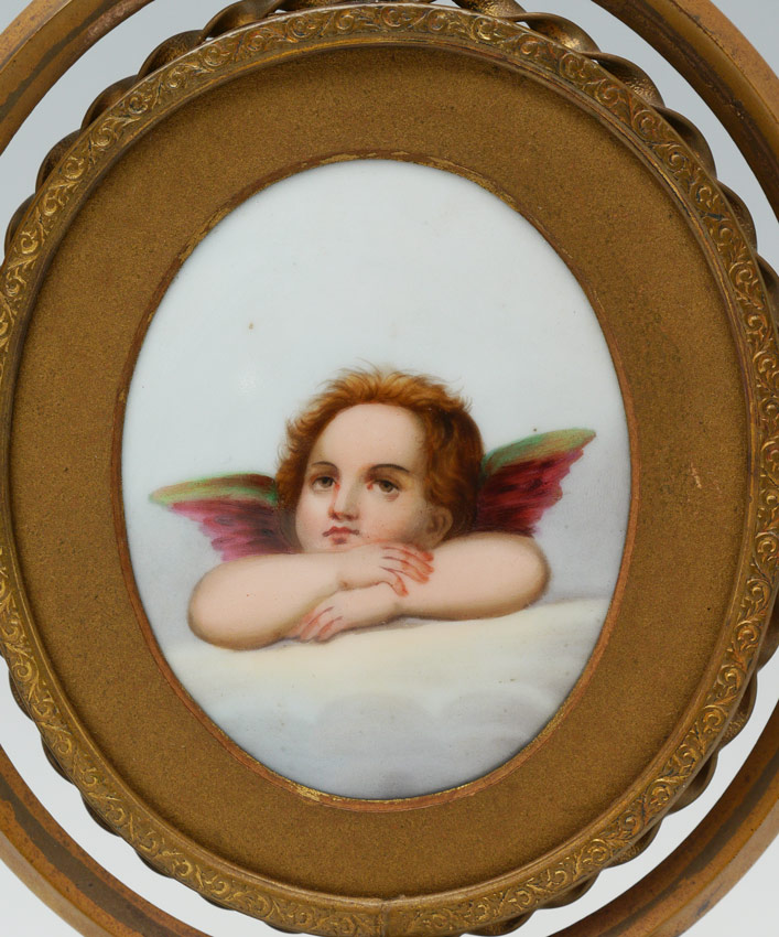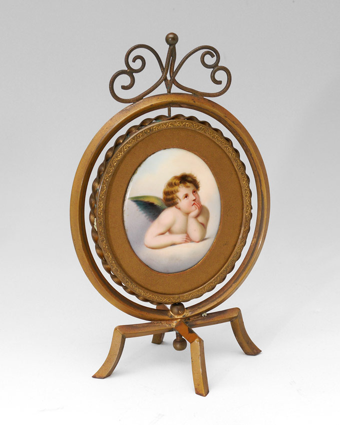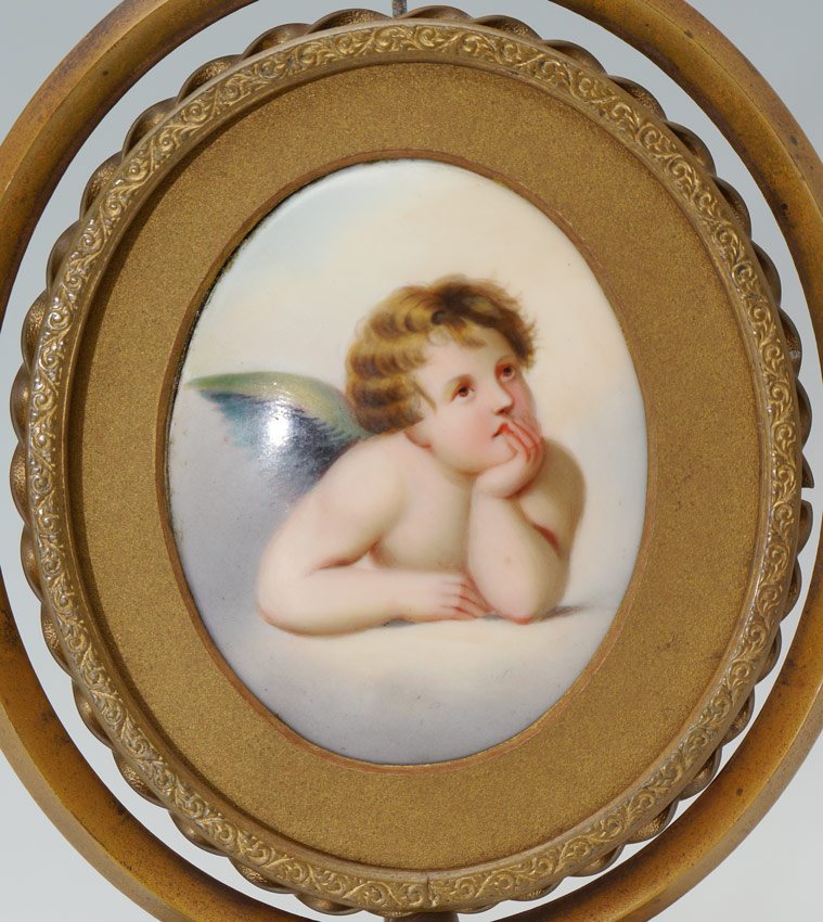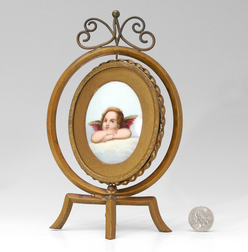 MINIATURE PAINTED PORCELAIN TABLE SCREEN AFTER RAPHAEL: Two-Sided Painting on Porcelain on a Revolving Stand, Oval 3'' x 2 1/2'', circa 1930.
