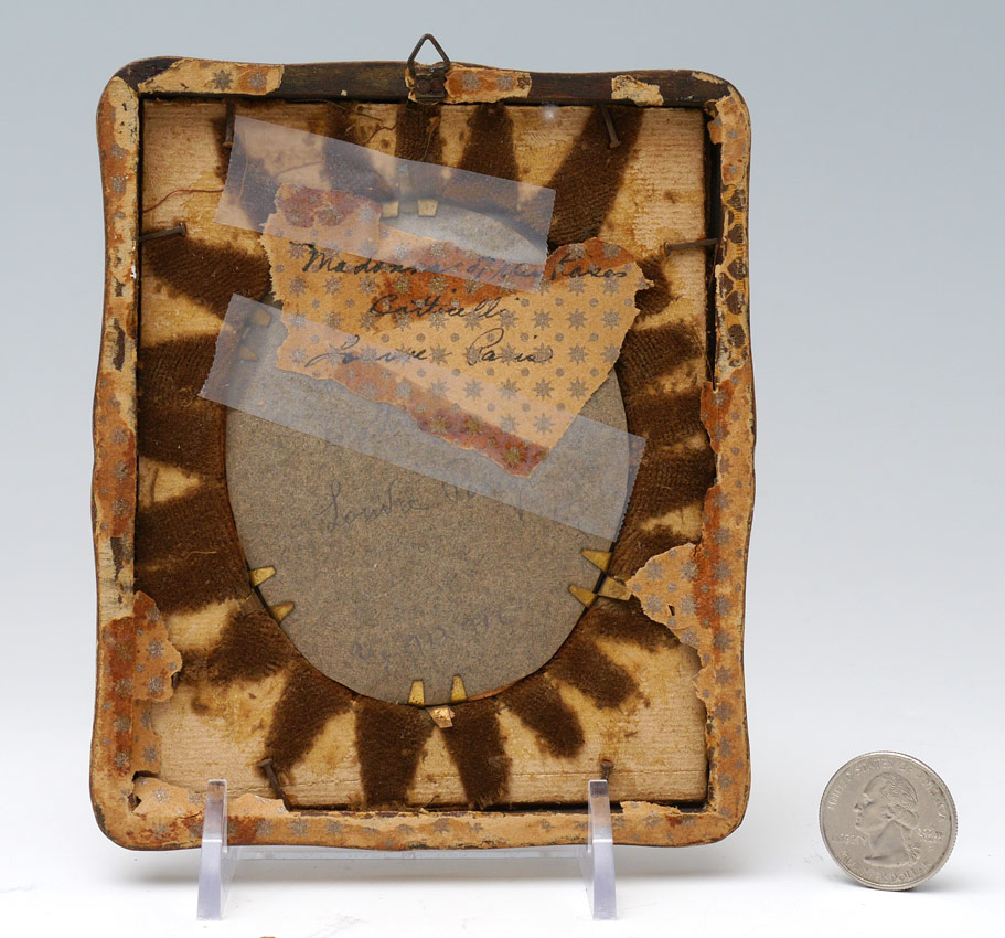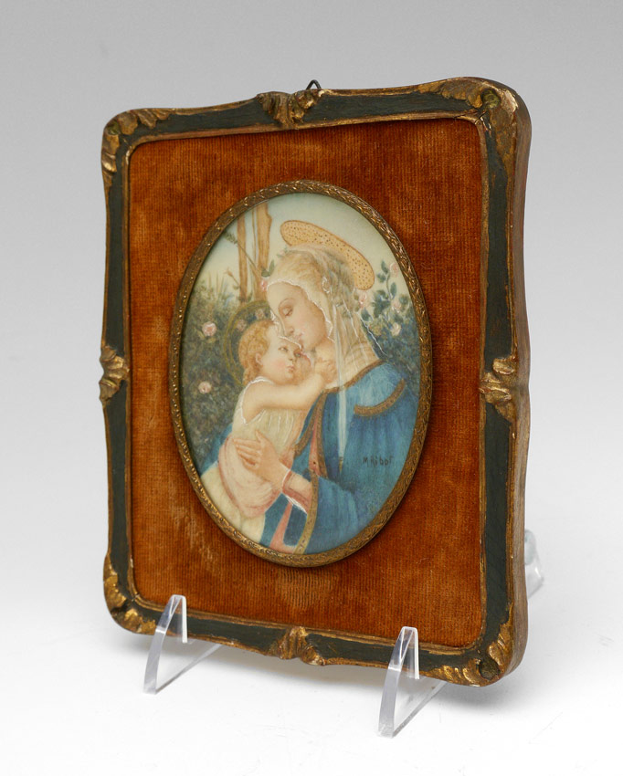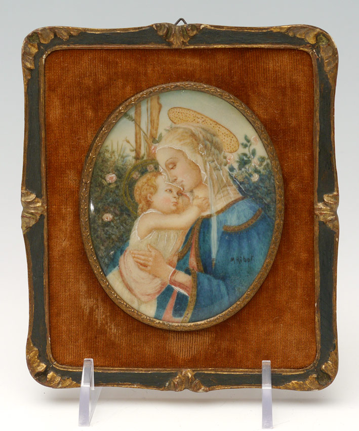 MINIATURE PAINTING MADONNA OF THE ROSES AFTER BOTTICELLI: Watercolor on Celluloid, Oval 3 1/2'' x 2 1/2'', signed lower right, M. Ribot, after the antique in the Louvre, Paris, worn custom carved and painted wood frame 5 1/4'' x 4 1/2''.