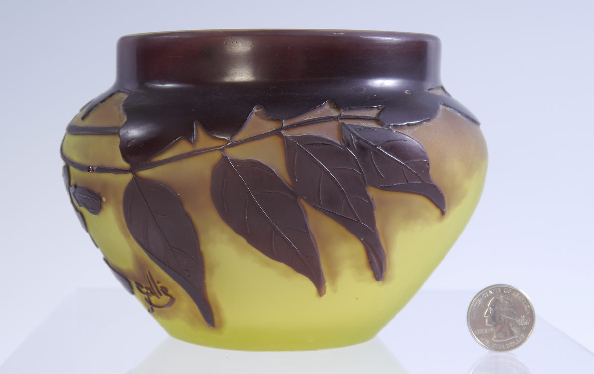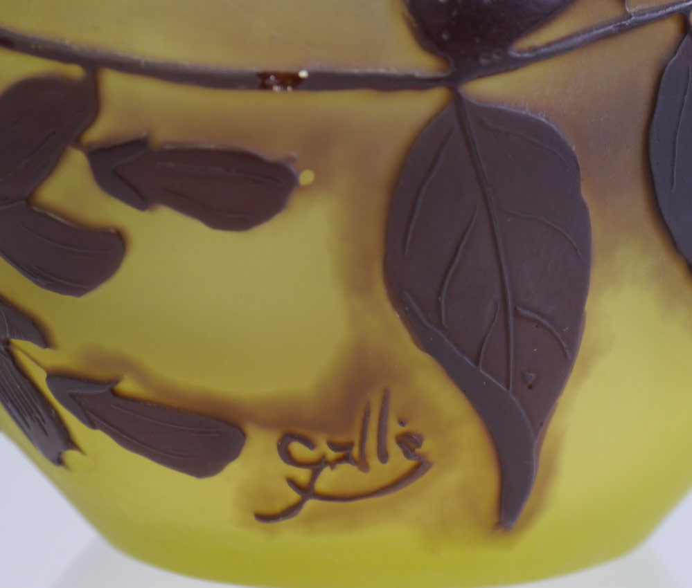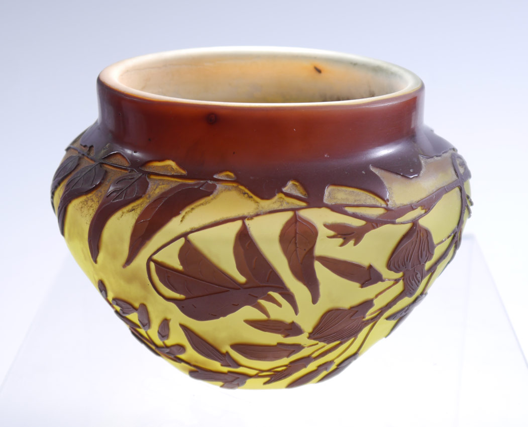 CAMEO GLASS VASE SIGNED GALLE: Squat vase cameo cut in a floral design, 5''h. x 6''.
