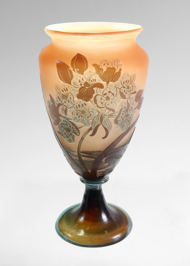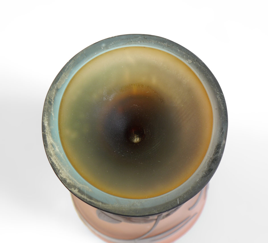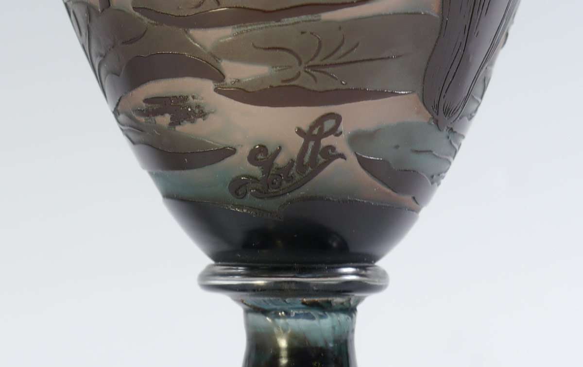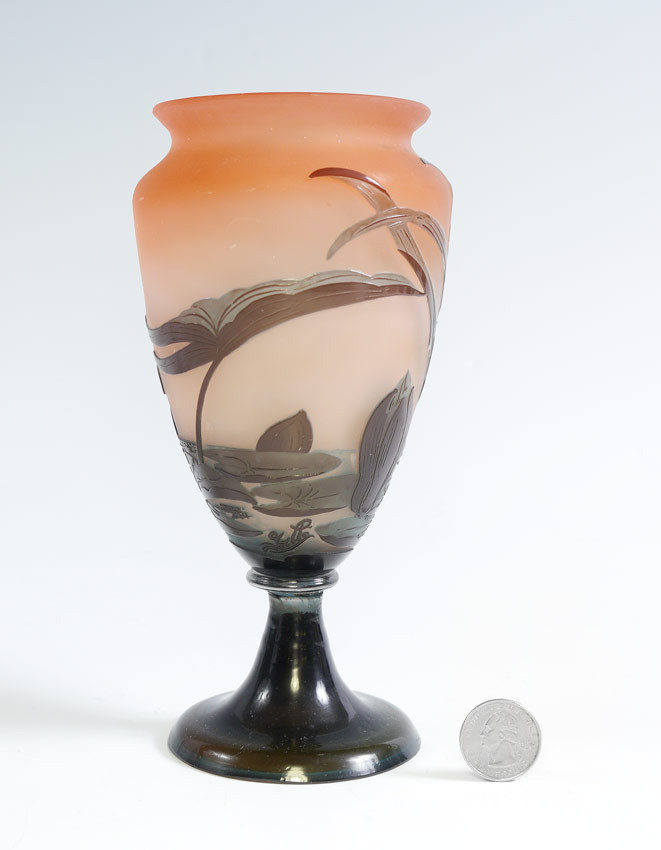 CAMEO GLASS VASE SIGNED GALLE: Cameo cut in a water lily design, 8''h.