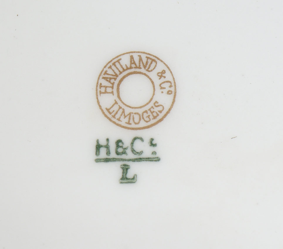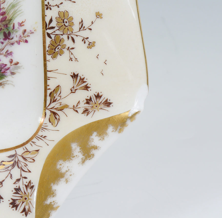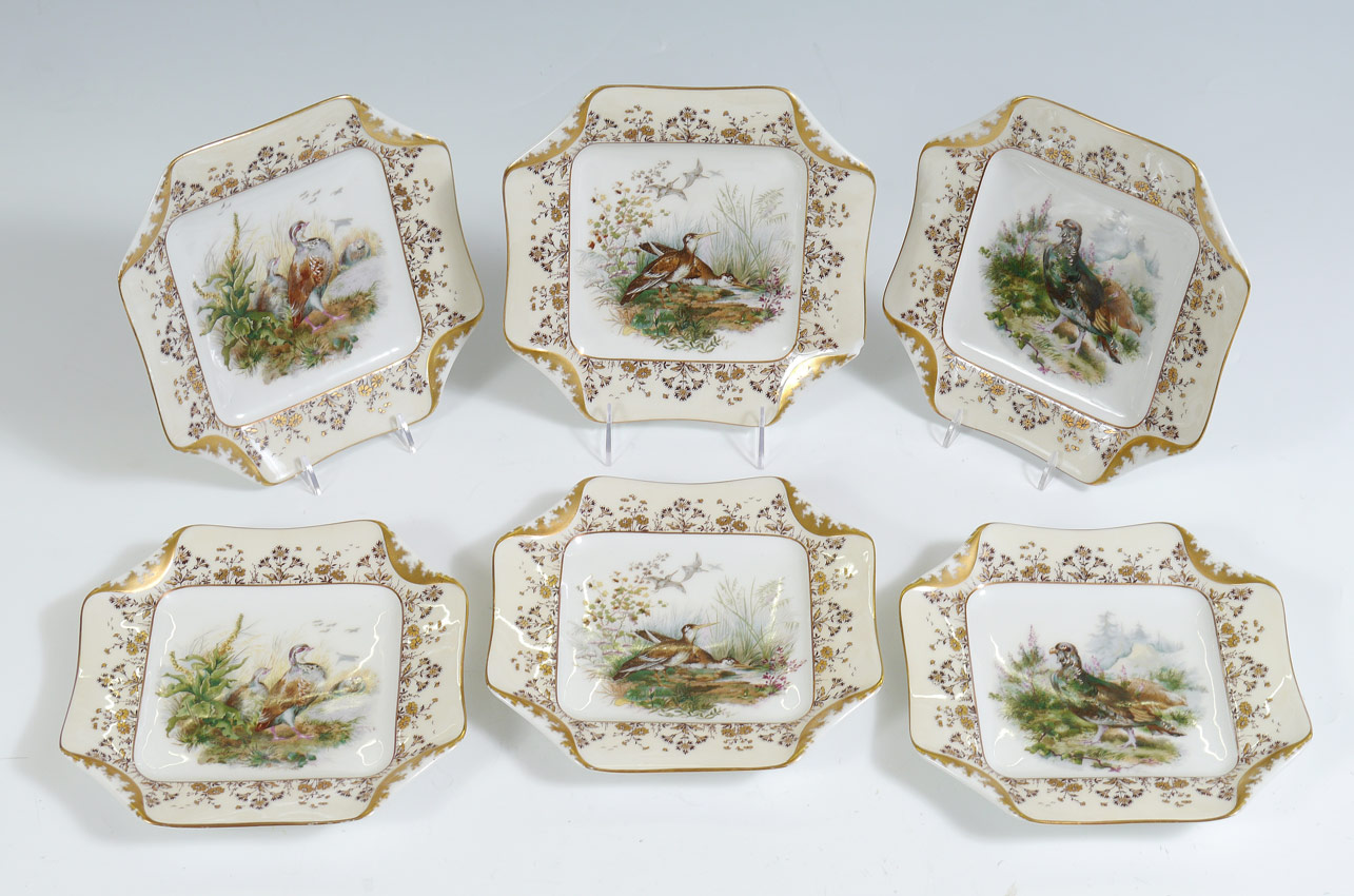 6 FRENCH HAVILAND LIMOGES HAND PAINTED PLATES: Game decorated plates with floral and gilt borders. Marked Haviland & Co. Limoges on base. 8 3/4'' square.