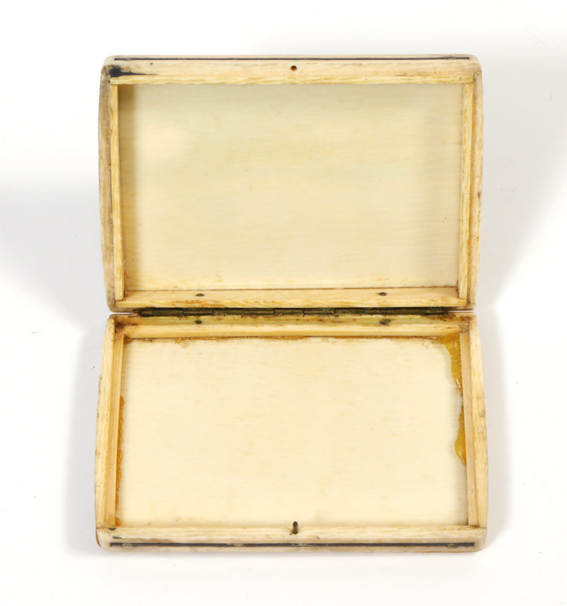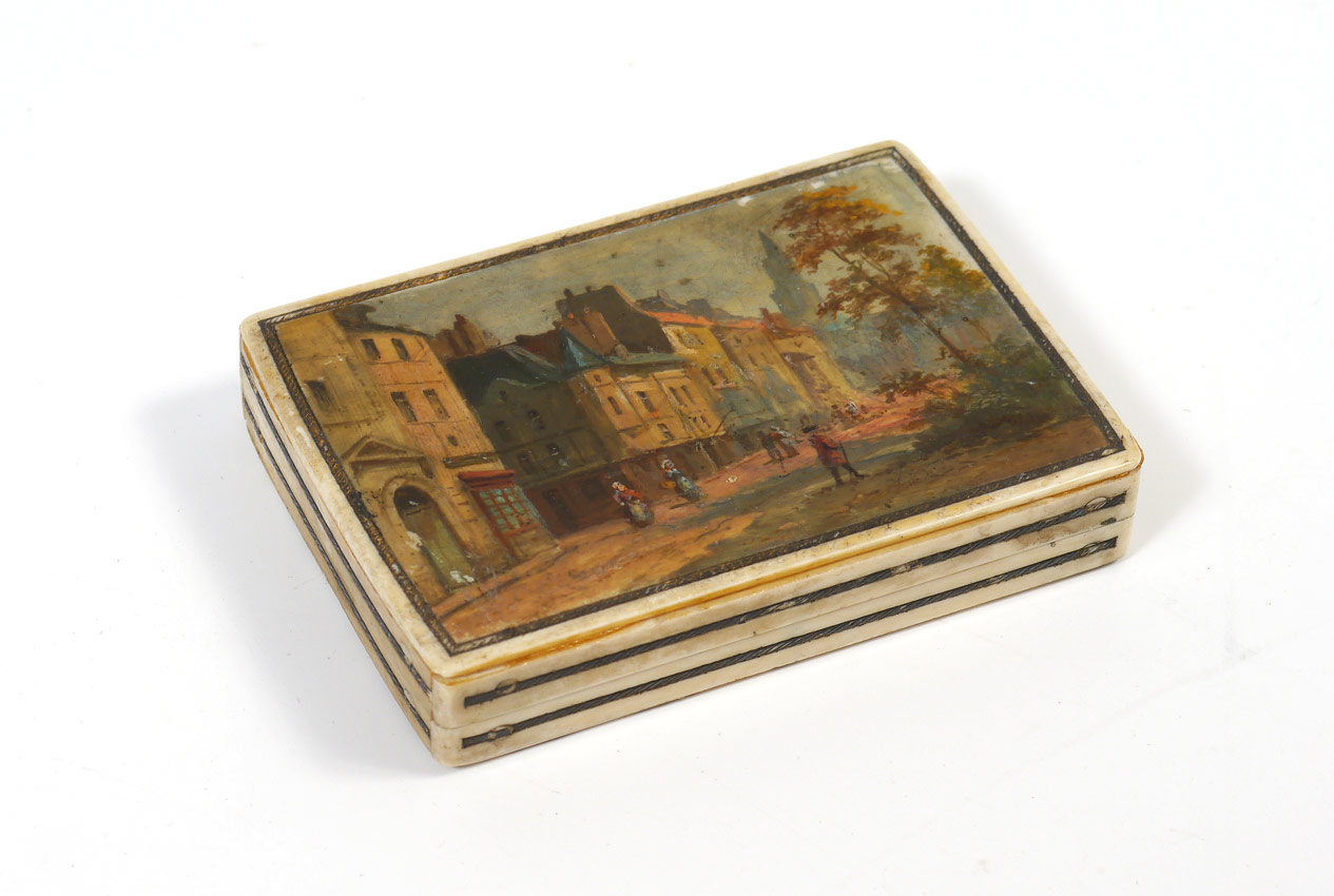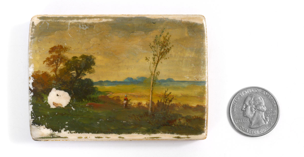 HAND PAINTED IVORY BOX: Hand painted with European town scene on hinged lid, landscape with figure on bottom. 3 1/4'' x 2 1/4''.