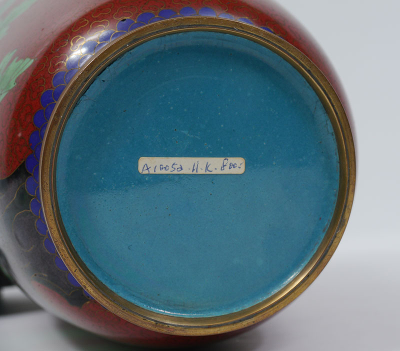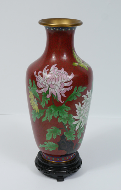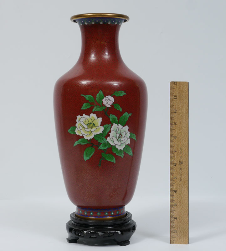LARGE CHINESE CLOISONNE VASE: Ox blood red ground with floral design and bird in flight. Unsigned. Measures 15 1/4'' h. x 7''. Sold with wood stand 2'' h. x 5 1/2''.