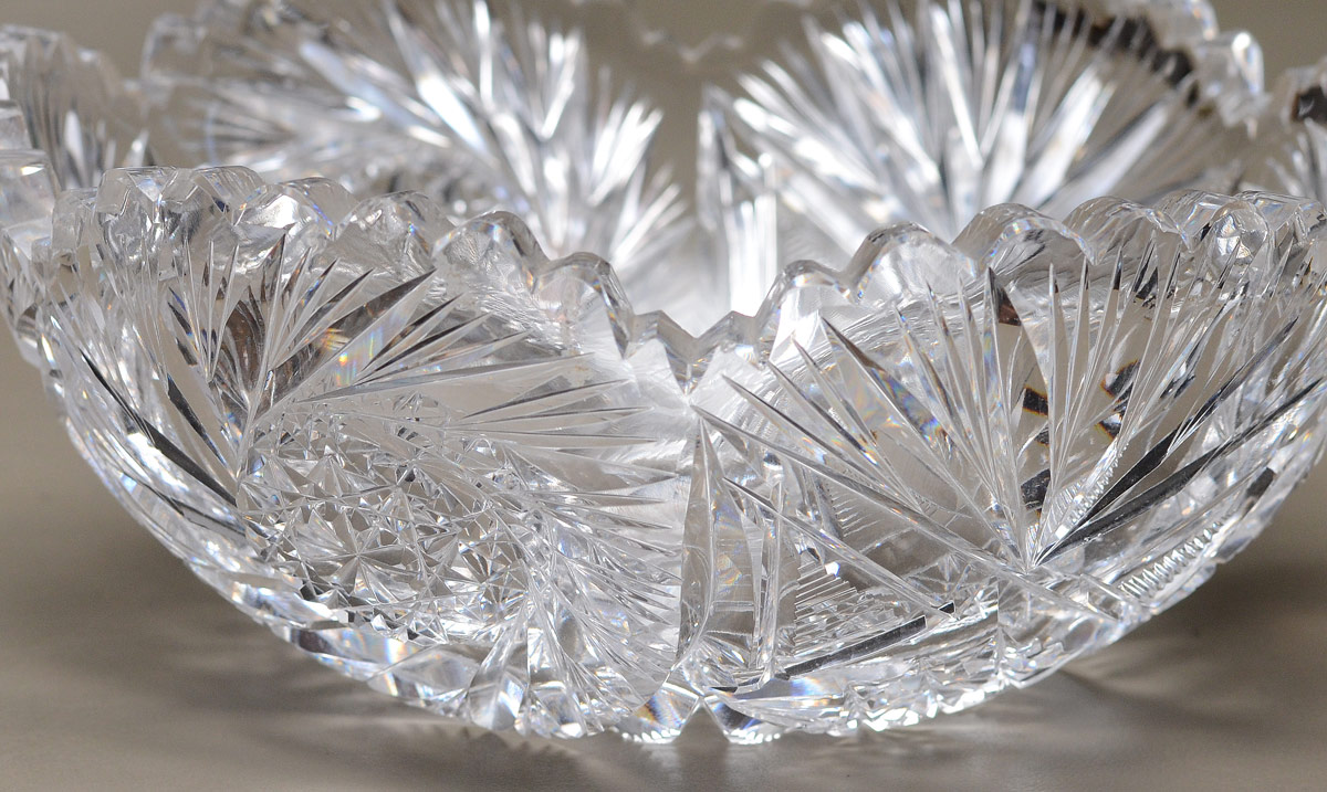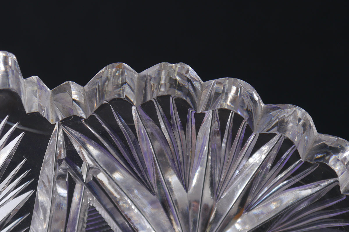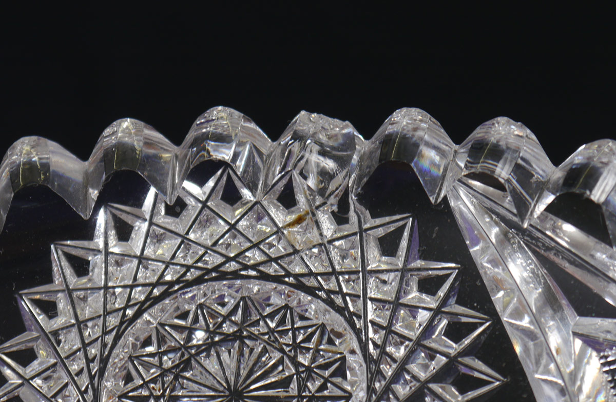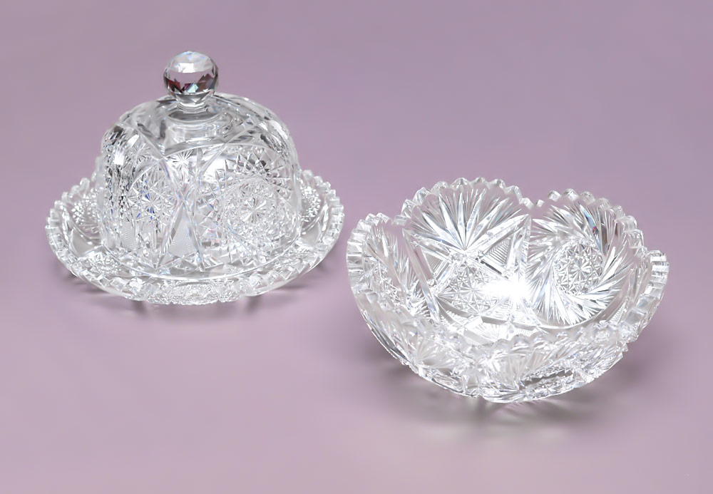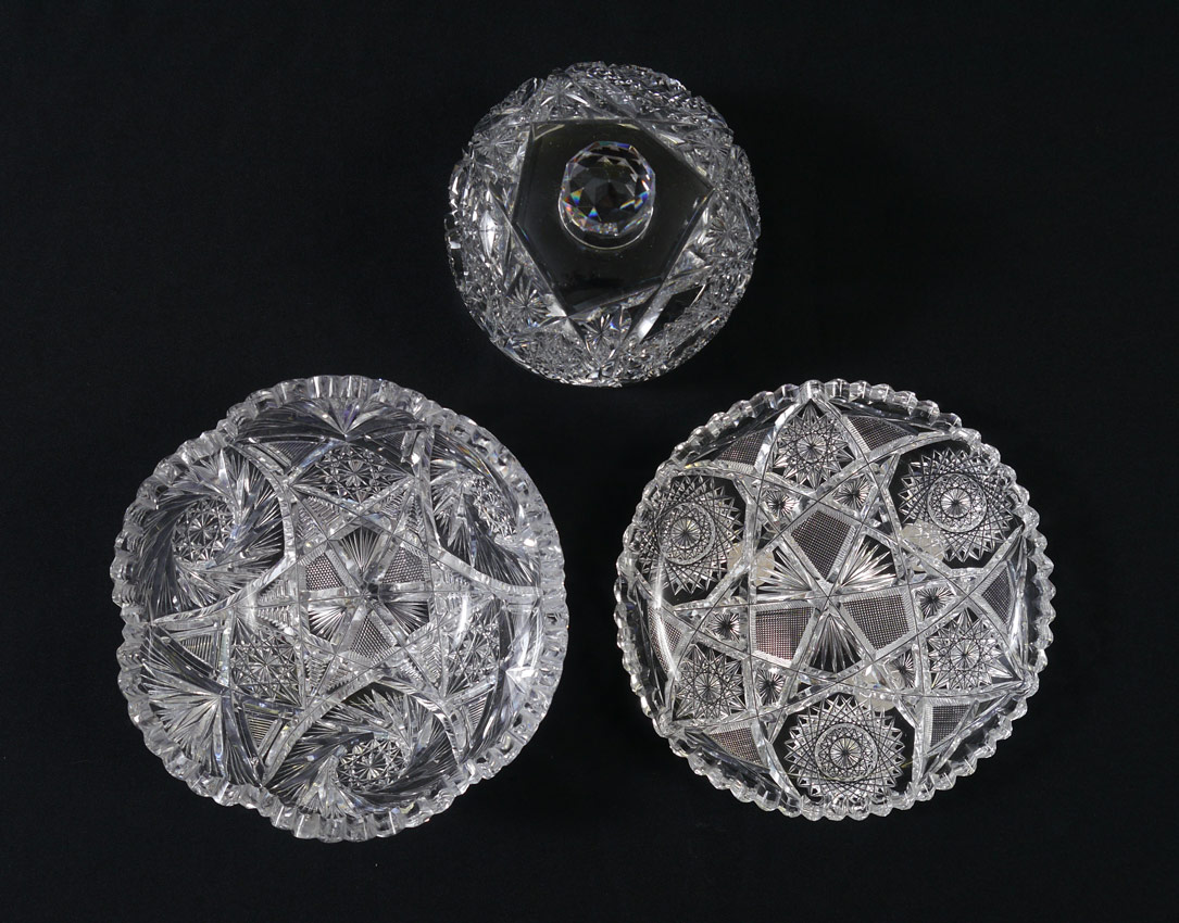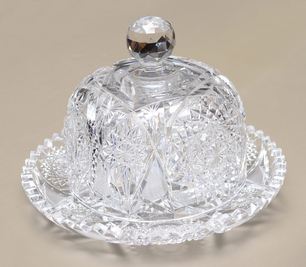 AMERICAN BRILLIANT CUT GLASS COVERED CHEESE DISH & BERRY BOWL: 3 pieces total to include 1) Berry bowl, 3 1/2'' h. x 8 1/4''. 2-3) Cheese dish and cover, 6 1/4'' h. x 9'' dia.
