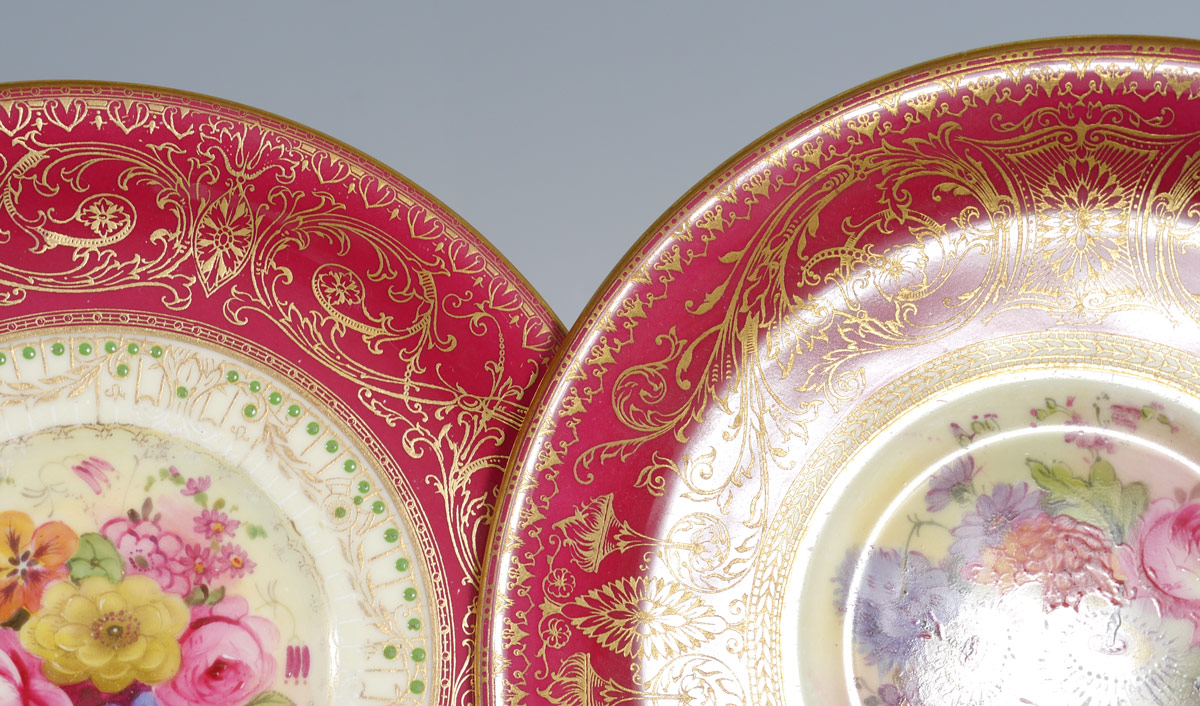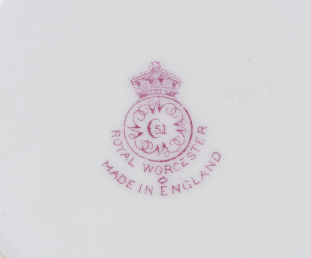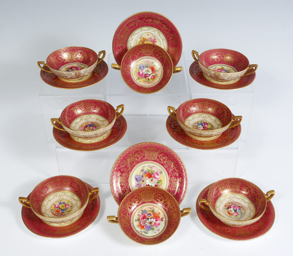 SET OF 8 ROYAL WORCESTER CHINA CREAM SOUP CUPS AND SAUCERS: Artist signed floral design. The saucers measure 6 1/2'' dia., the cups 6 3/4'' dia. overall. Doris Baker-Mansergh Estate