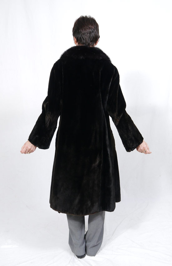 FULL LENGTH SEAL FULL COAT WITH MINK COLLAR: J Diamond label. Black seal with black mink collar, measures 44'' collar to hem and 18'' shoulder to shoulder.