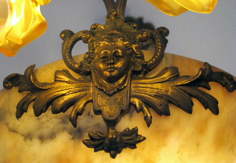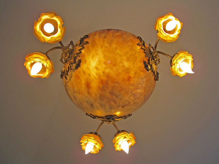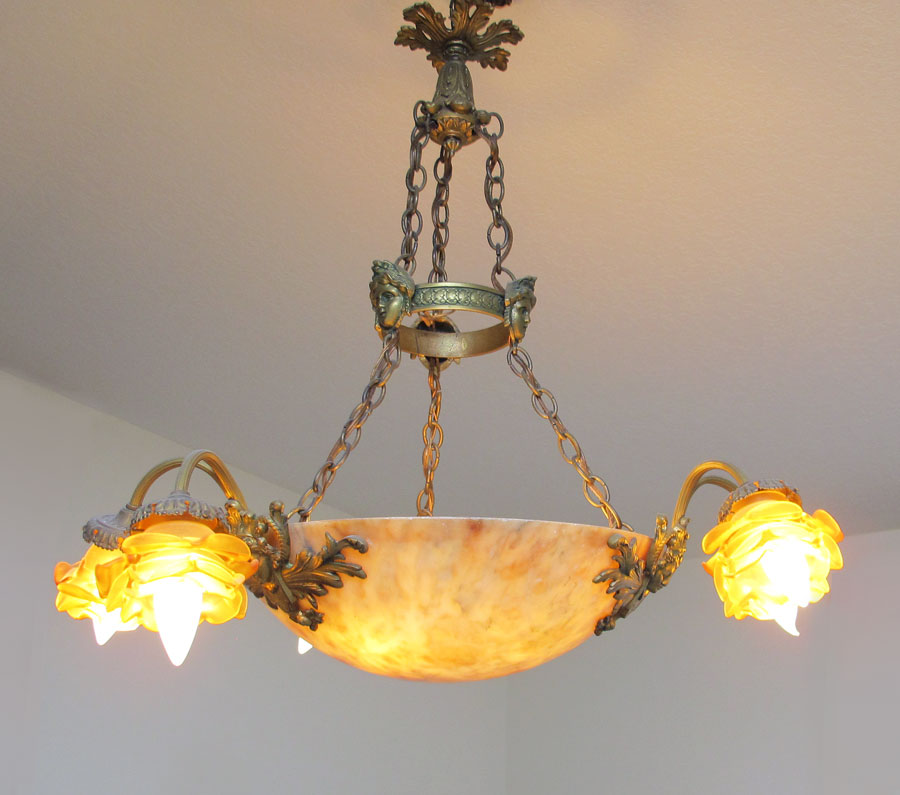 ALABASTER 6 LIGHT CHANDELIER: Alabaster dome shade with 6 amber glass floral shades and masqueron. 26 1/4'' h. x 25'' dia.