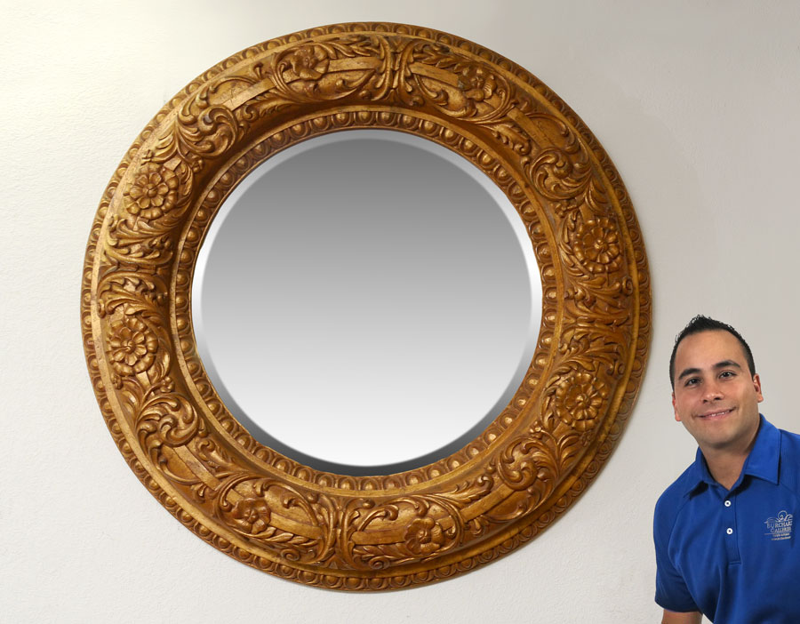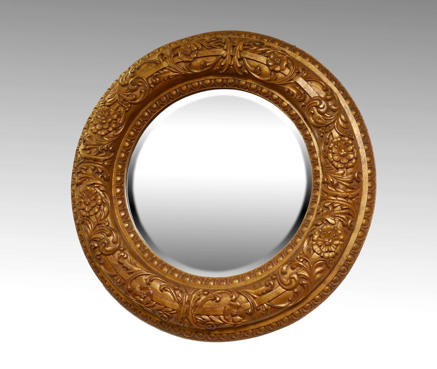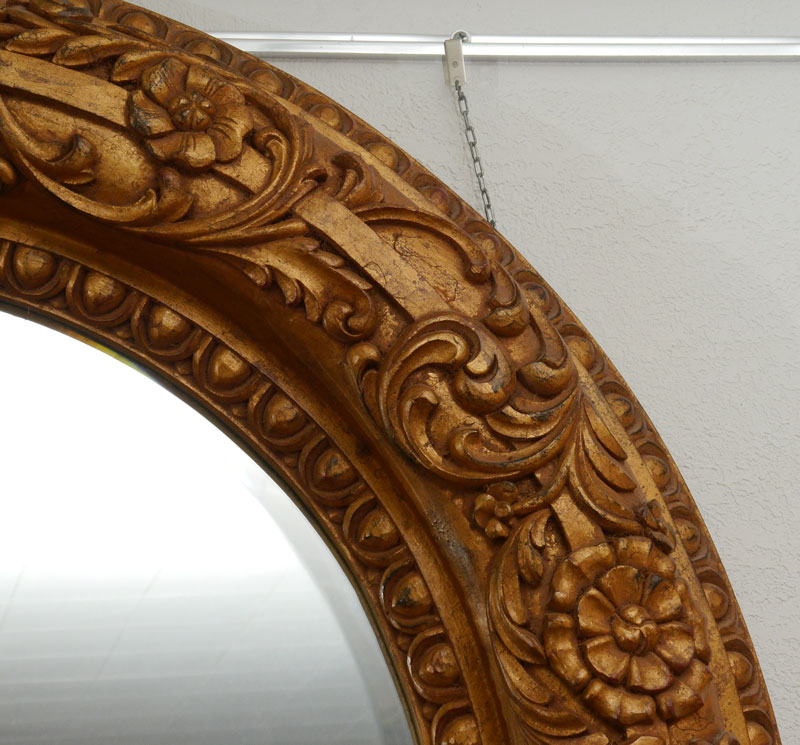 DRAMATICALLY OVERSIZED ROUND GOLD GILT MIRROR: Carved floral motif and gilt frame, beveled glass mirror. 51'' dia. overall, mirror 30''.