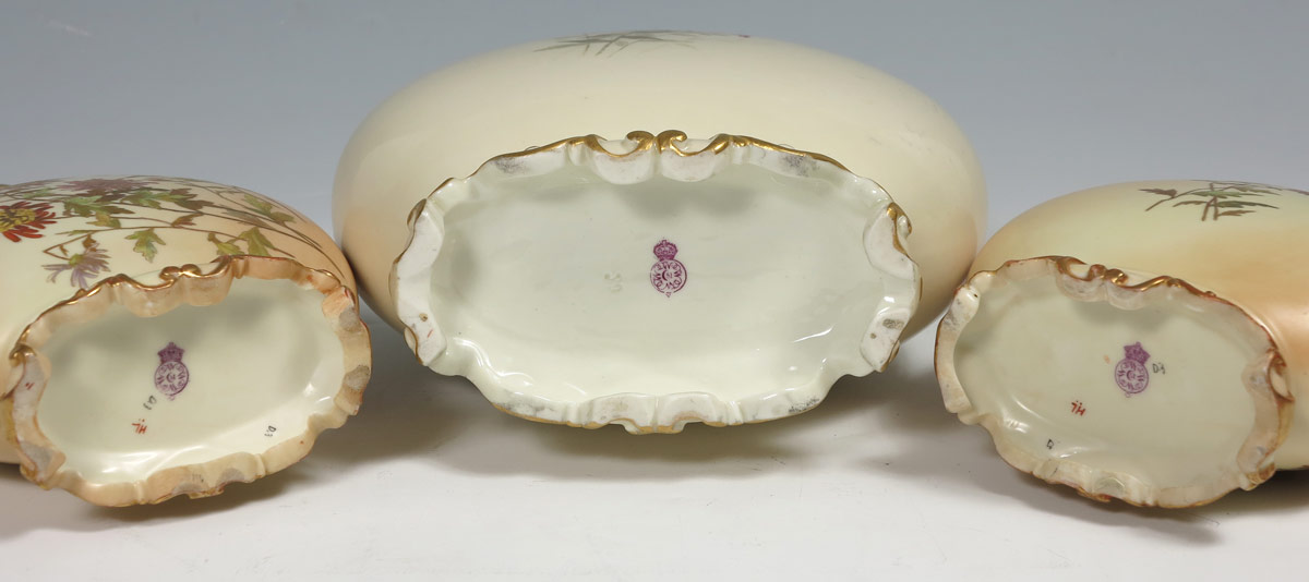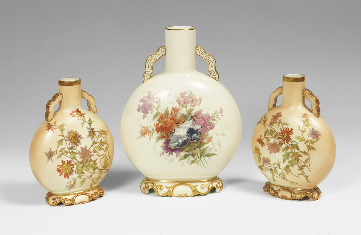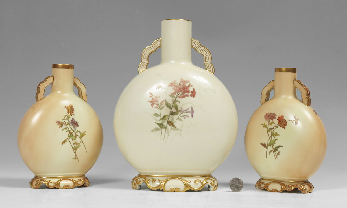 3 ROYAL WORCESTER MEDALLION VASES: Floral decoration embellished with gold. The pair measures 9'' tall, the larger one 11 3/4''. All are marked.