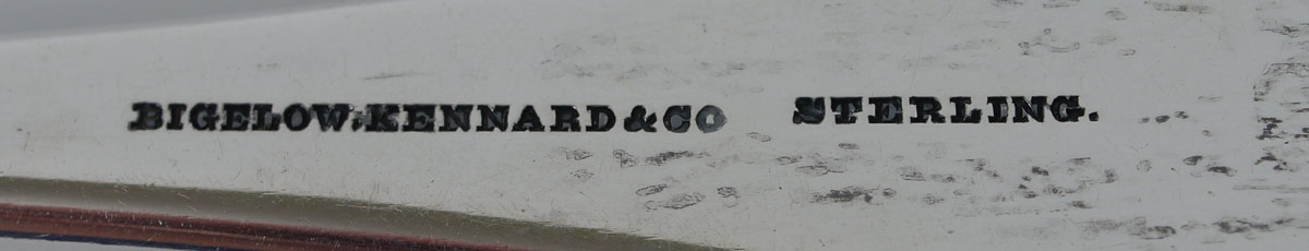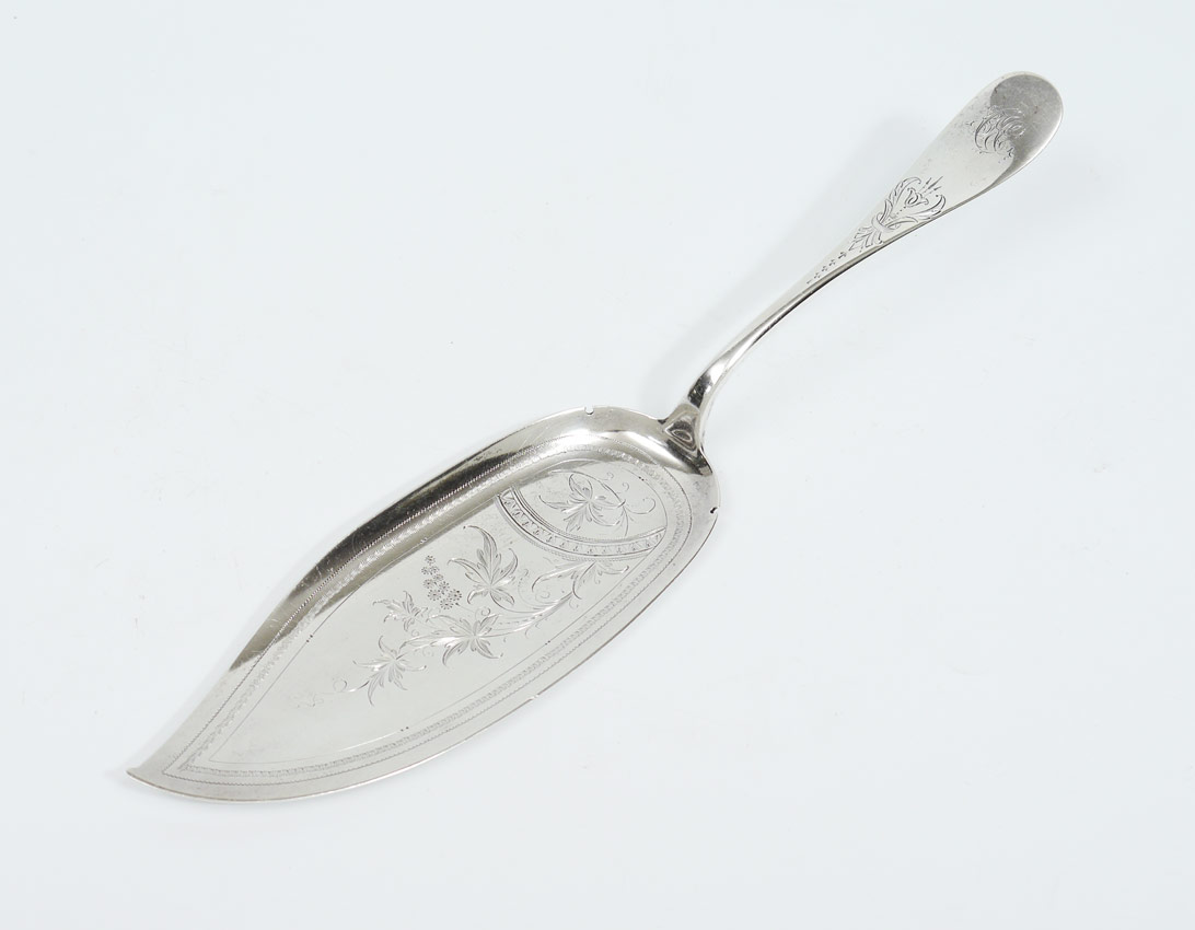 BIGELOW KENNARD ENGRAVED STERLING CAKE SERVER: Engraved foliated motifs, monogrammed. Marked Bigelow Kennard & Co. Sterling. 12 1/4''. Approx. 5.0 troy oz.