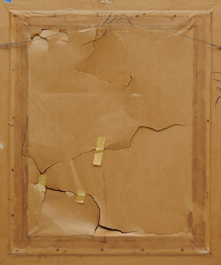 CONDITION: Craquelure throughout, there is some uplifting of the paint in the lower right corner, repair to puncture, needs cleaning.
