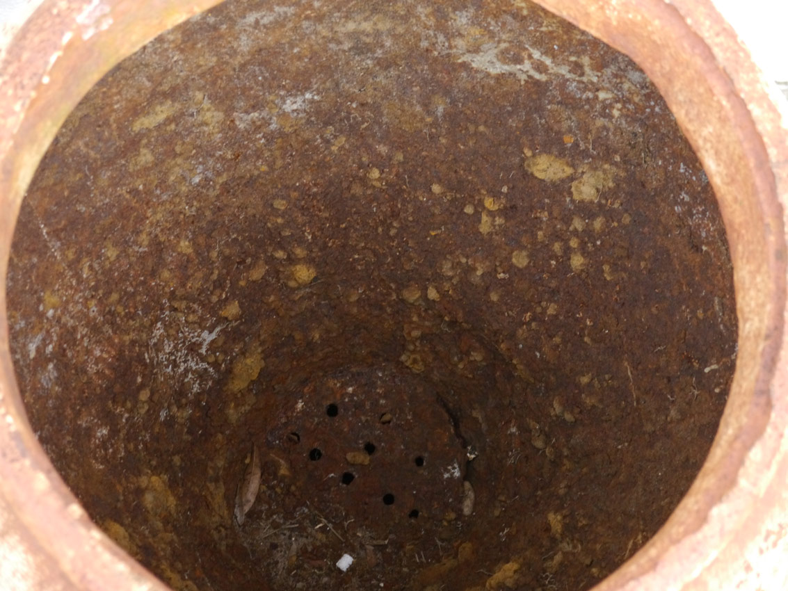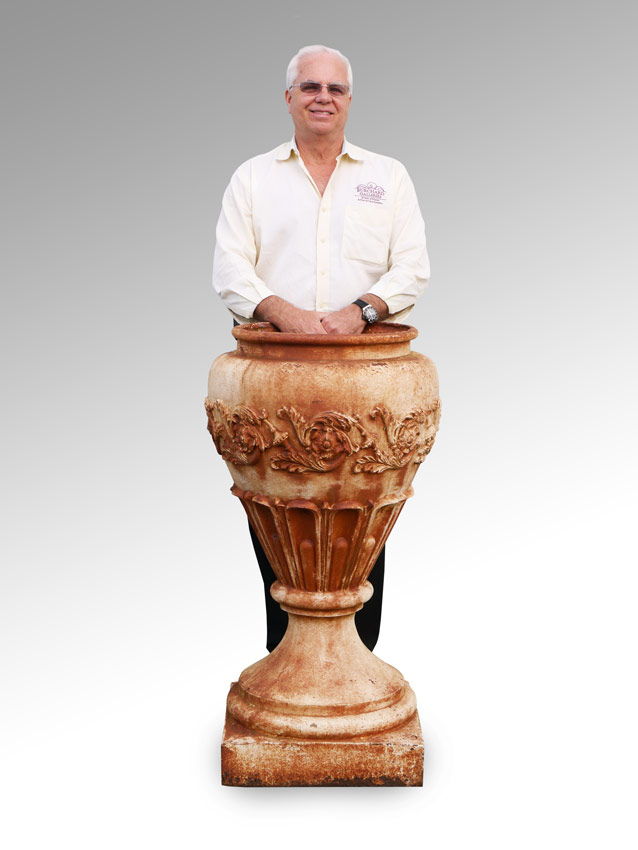 LARGE CAST IRON GARDEN URN VASE: Lovely rusty patina caused by natural exposure, 43''h., approx. 24'' at widest.
