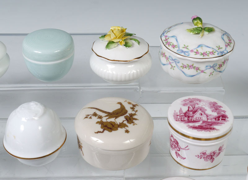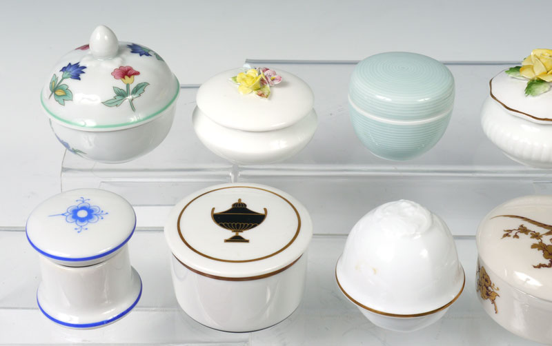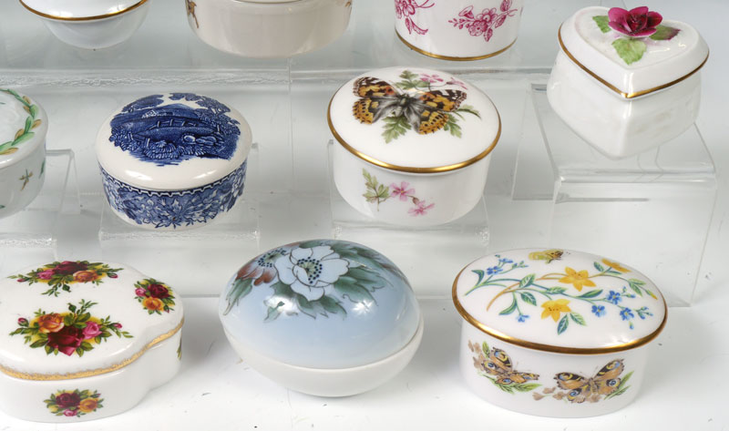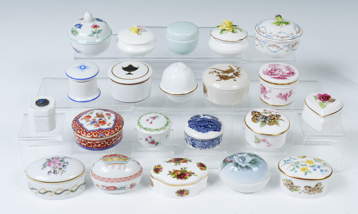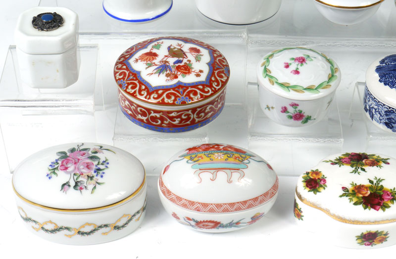 21 MINIATURE CHINA COVERED BOXES: Assorted size, shape, and makers to include Bing & Grohndal, Royal Hampton, Spode, Ginori, Keiser, Haviland, Crown Staffordshire. Largest measures 2 1/8'' h. x 2 3/4''.