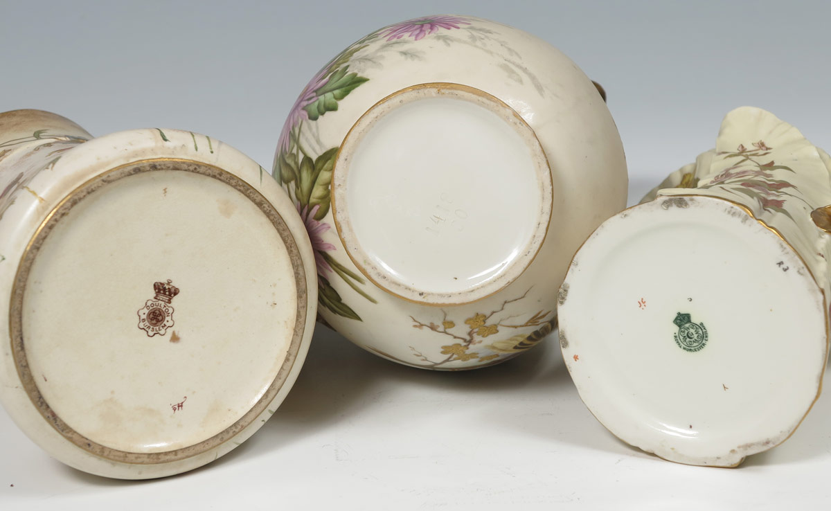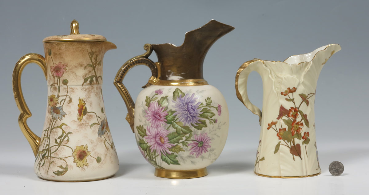 ROYAL WORCESTER & DOULTON PORCELAIN PITCHERS & CHOCOLATE POT: 1) Doulton Burslem floral decorated chocolate pot, 10'' tall. 2) Water pitcher, bird decorated on one side, florals on the other, 10'' tall, unmarked. 3) CA. 1892. Hand painted floral design on embossed leaf design, 8 1/4'' tall.