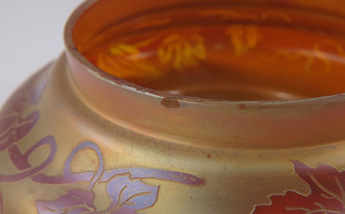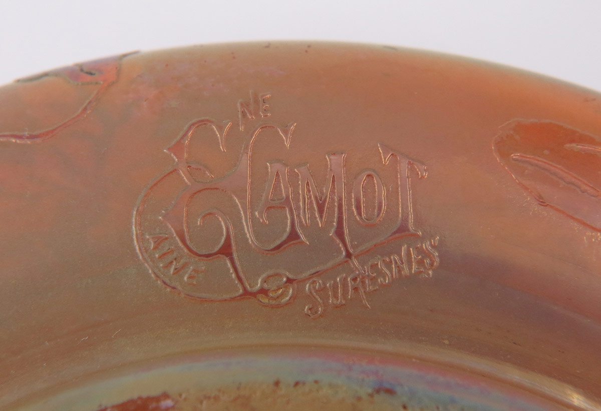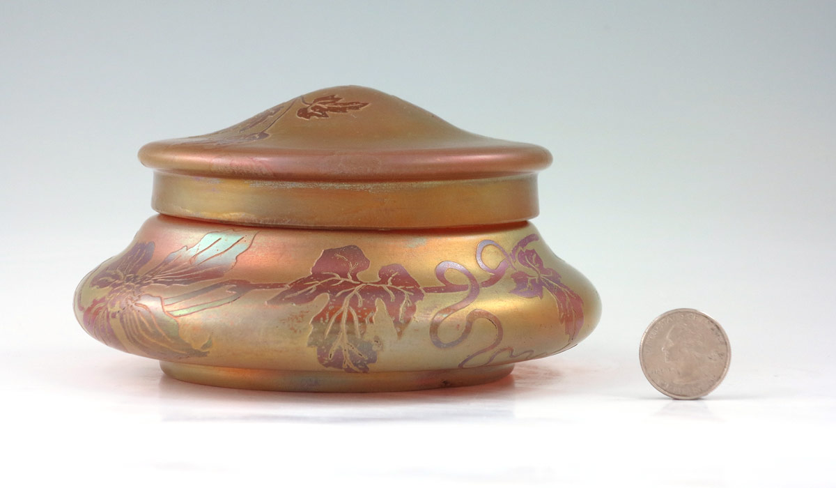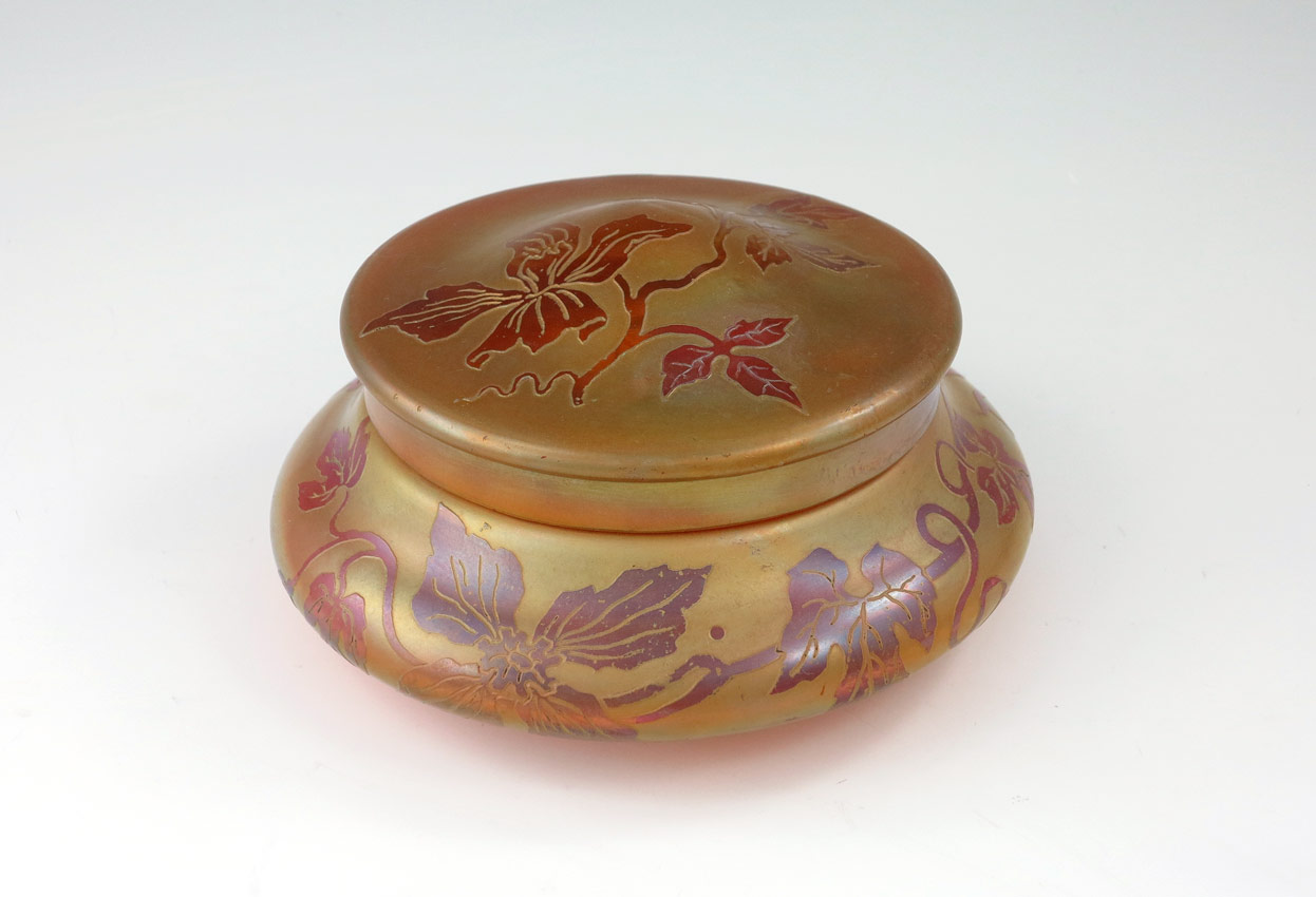 EUGENE & EMILE CAMOT FRENCH ART GLASS COVERED JAR: Iridized ground and etched glass leaf design. Signed in cameo. Measures 6'' dia. x 3.5'' tall.