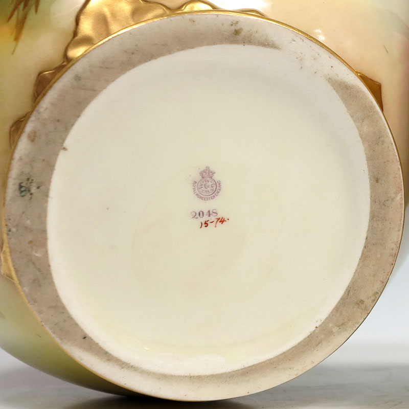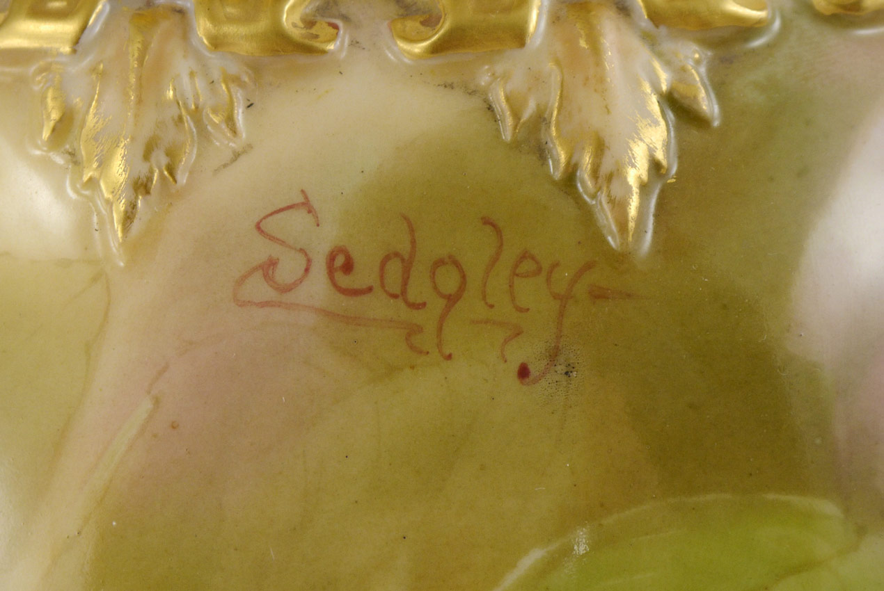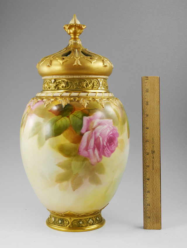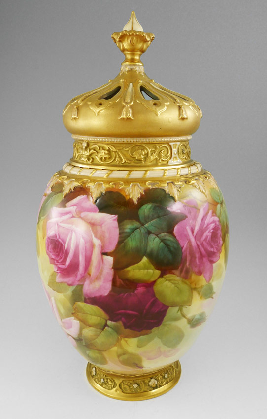 MONUMENTAL ARTIST SIGNED ROYAL WORCESTER COVERED POTPOURRI ROSE JAR: Handpainted by Walter Sedgley in the Hadley Rose design. Reticulated crown form lid and parcel gilt embossed base. Signed Sedgley. Shape 2048. Height approx. 17.5''.