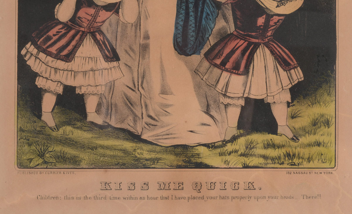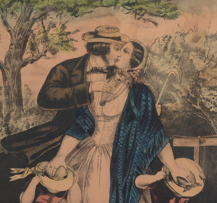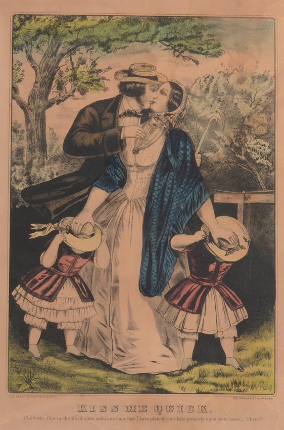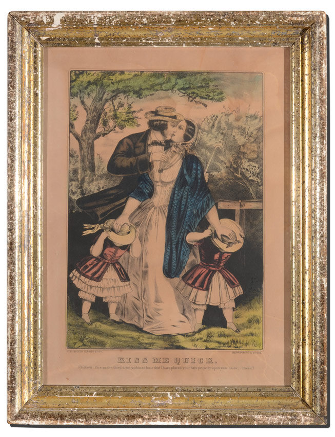 CURRIER & IVES KISS ME QUICK LITHOGRAPH: Hand tinted lithograph titled ''Kiss Me Quick'', sight size 14'' x 10 3/8'', framed 17'' x 13 1/2''. From the Doris Baker-Mansergh Estate