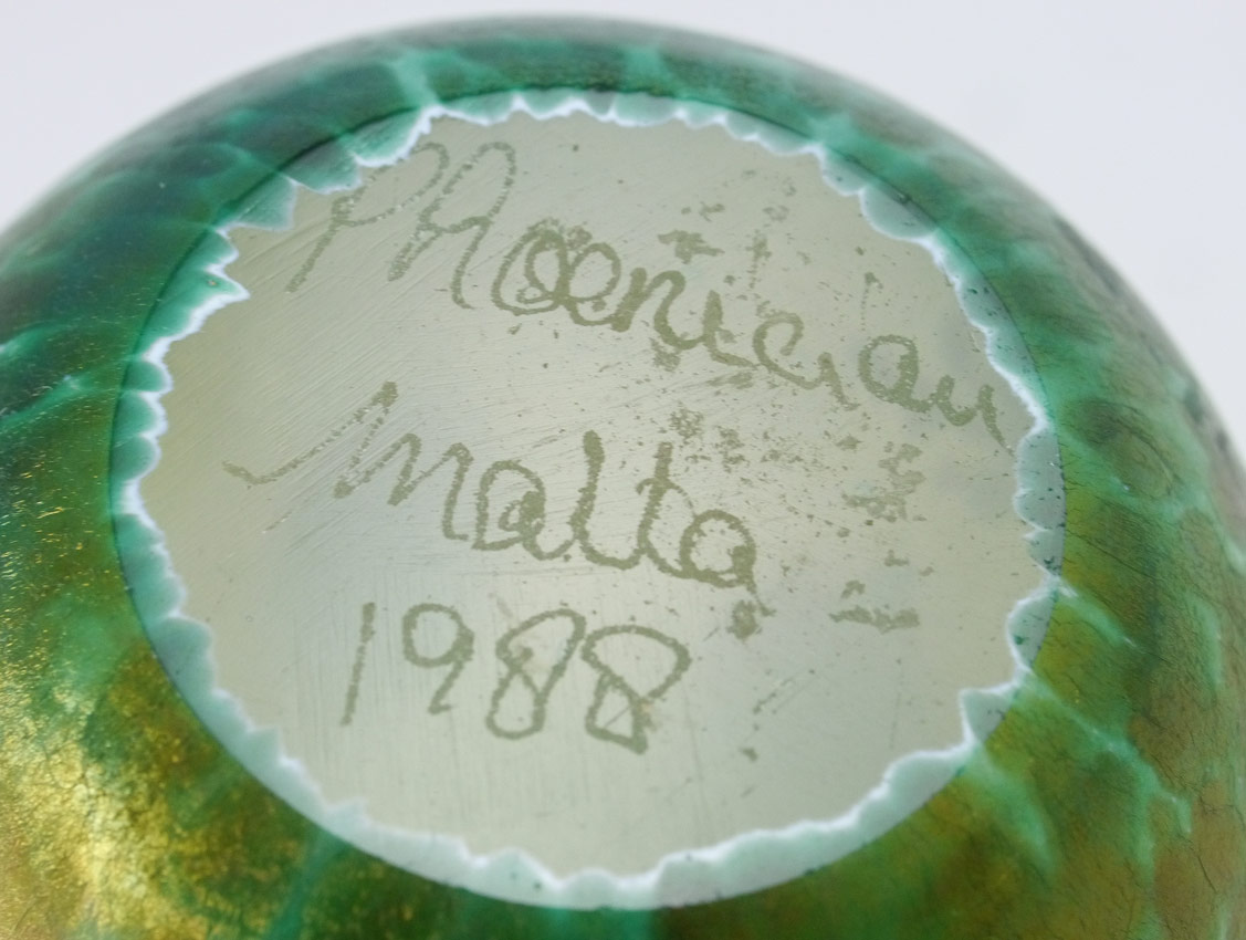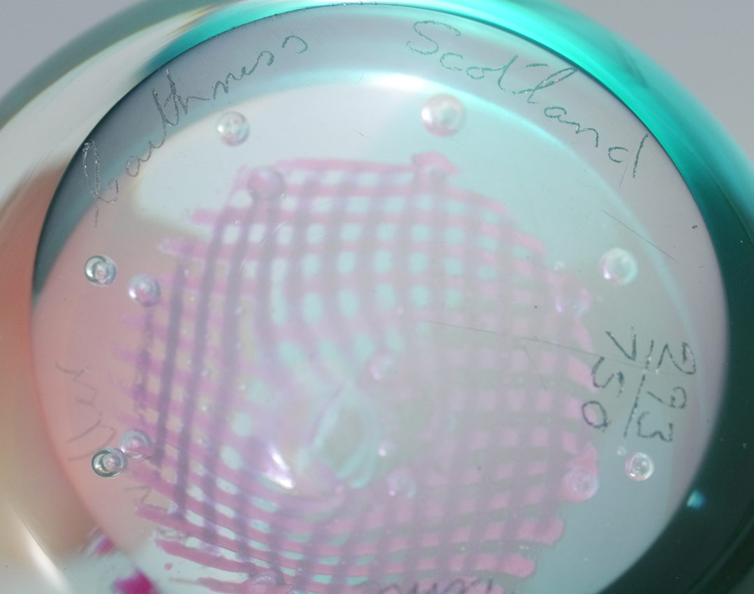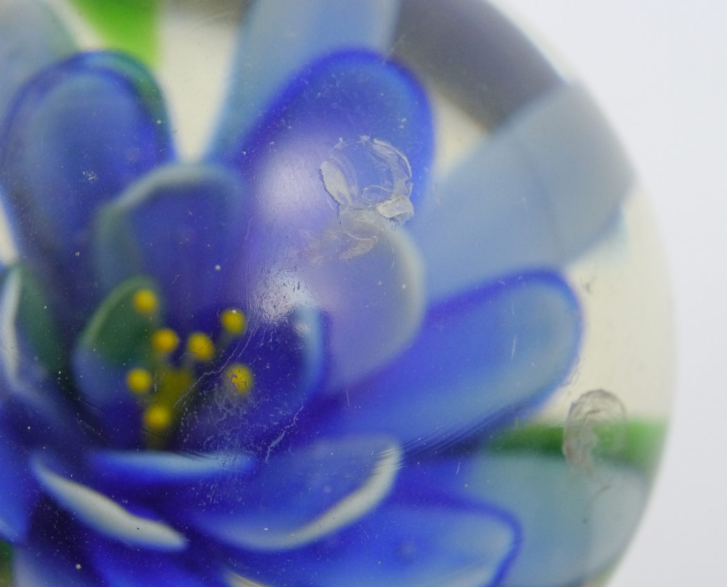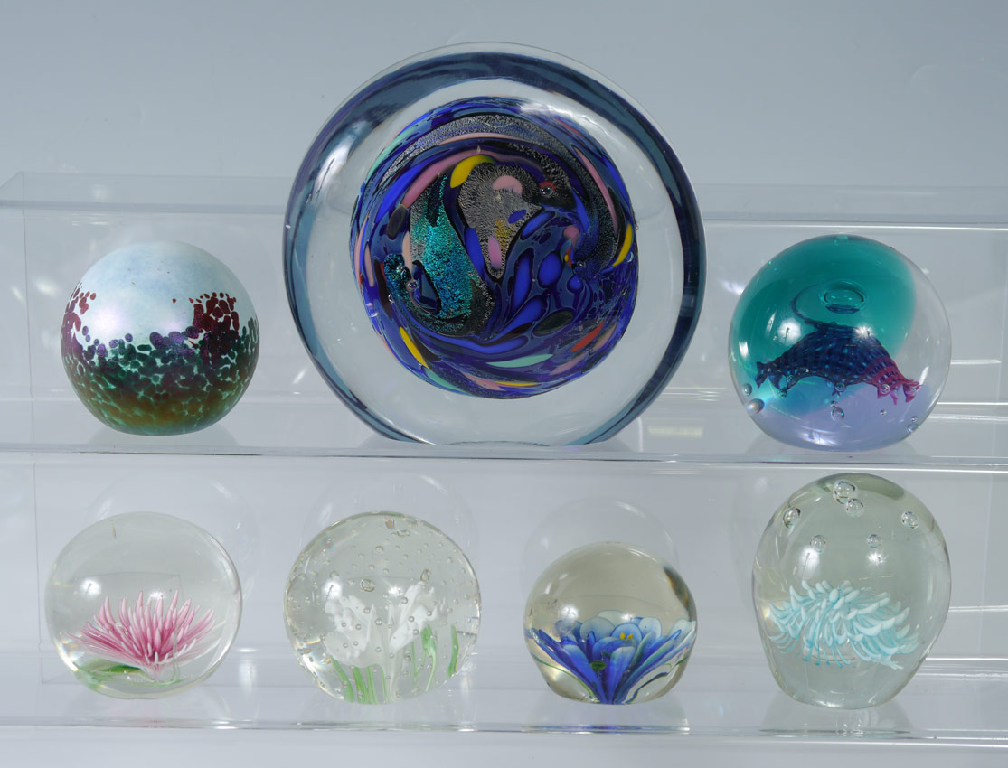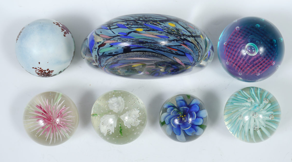 COLLECTION OF 7 ART GLASS PAPERWEIGHTS: 7 pieces total to include 1) Rollin Karg, 1997, 6'' dia. 2) Caithness ''Time Traveler'', 293/750, 3 1/2''. 3) Phoenician Malta, 1988, 3''. 4-7) 4 unsigned with flowers, largest 3'' h.