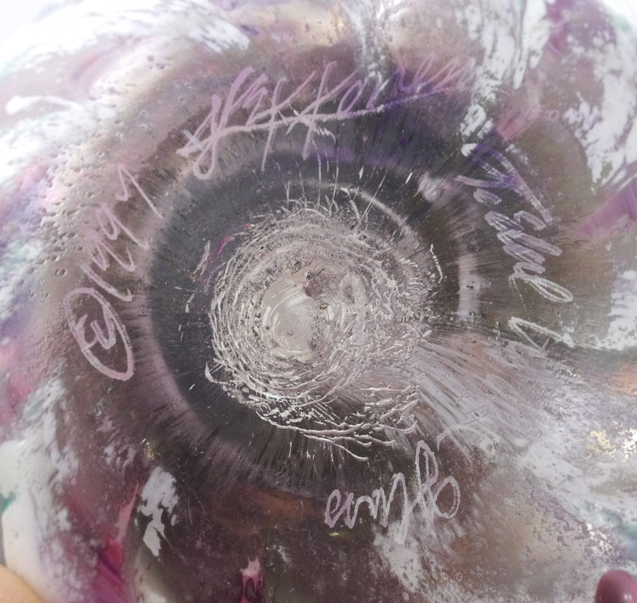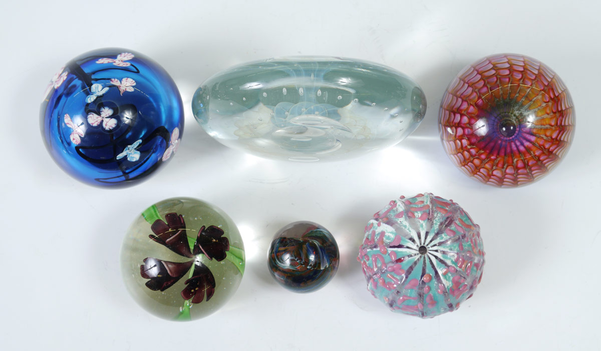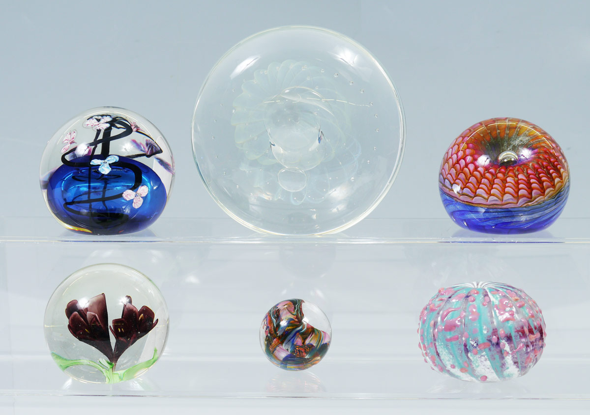 COLLECTION OF 6 ART GLASS PAPERWEIGHTS: 6 pieces total all illegibly signed or unsigned, largest 5'' dia., smallest marble form 1 1/2'' dia.