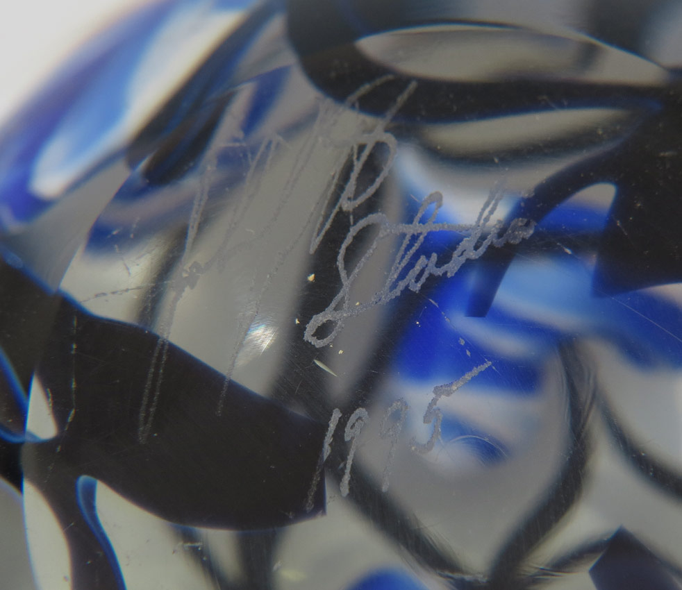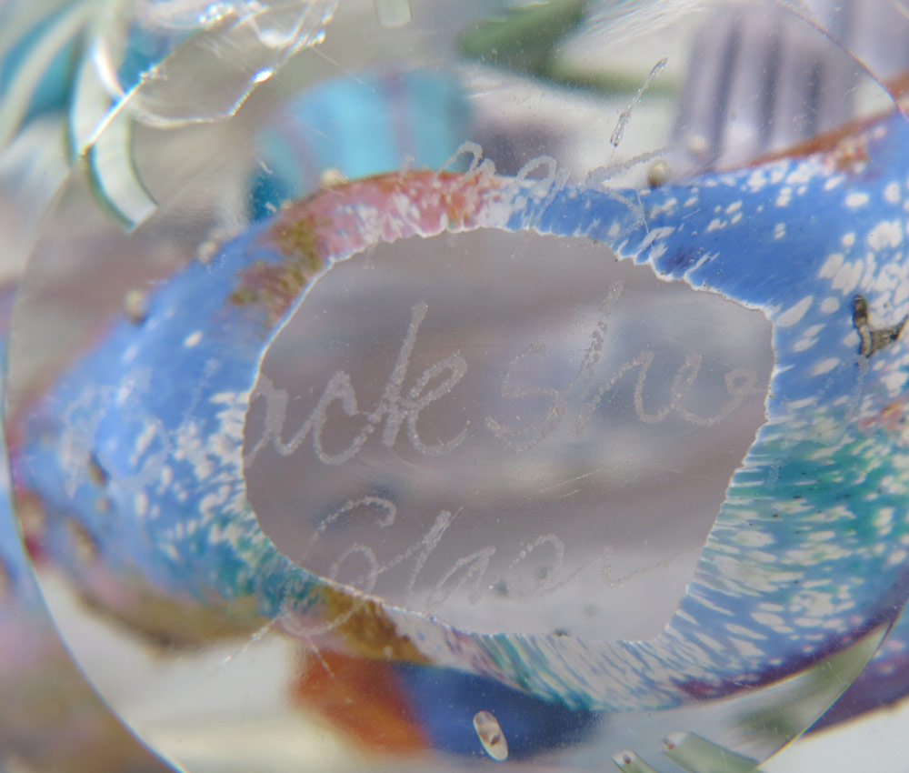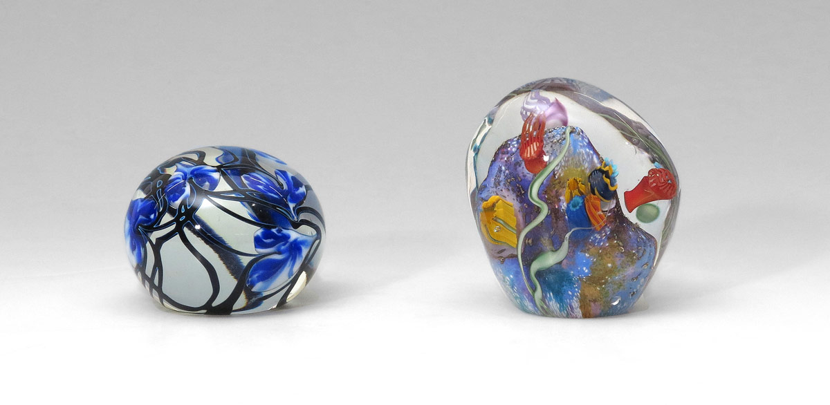 2 ART GLASS PAPERWEIGHTS LOTTON & BLACK SHEEP: 2 pieces total to include 1) John Lotton hearts and vines, 1995, 3'' dia. 2) Black Sheep millefiori coral reef motif, 1995 3 3/8'' h.