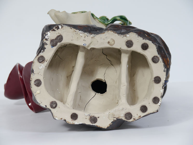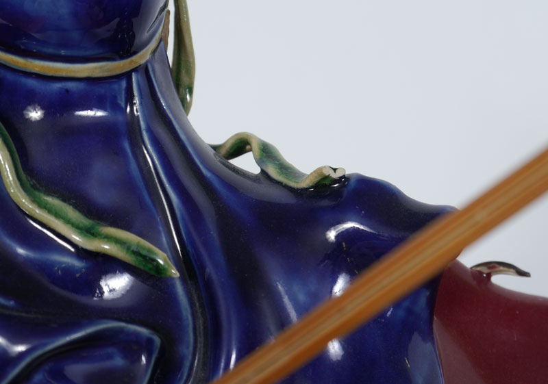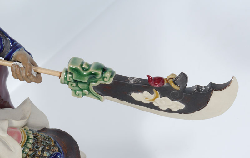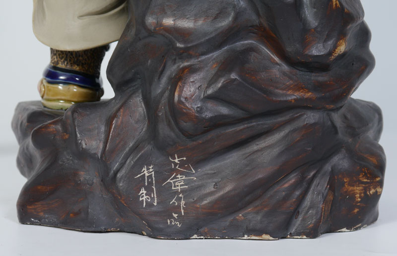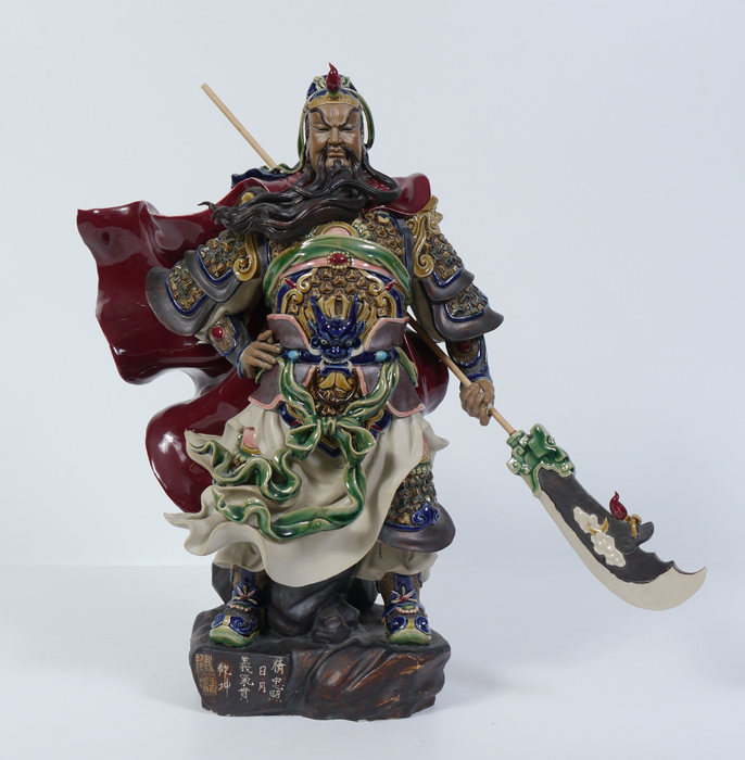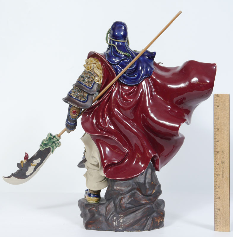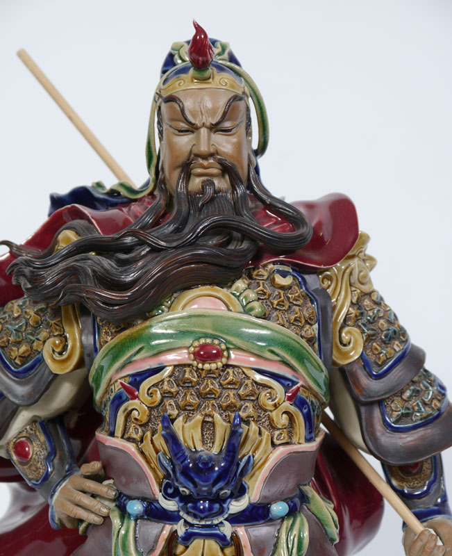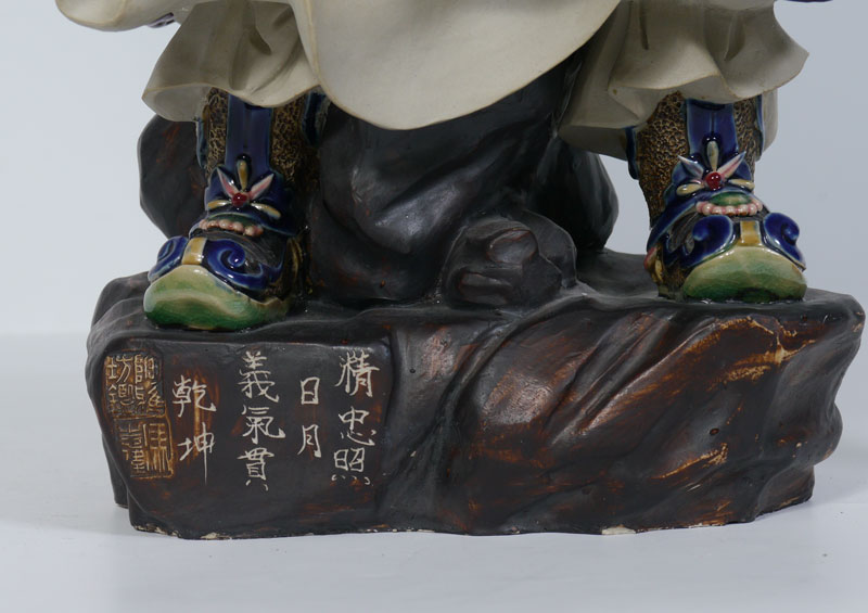 ORIENTAL EARTHENWARE FIGURE OF A WARRIOR: Highly detail figure of a warrior in full regalia with removable weapon. Marked in character front and back on base. Measures 18 3/4'' h. x 14 1/2'' x 7 1/4''.