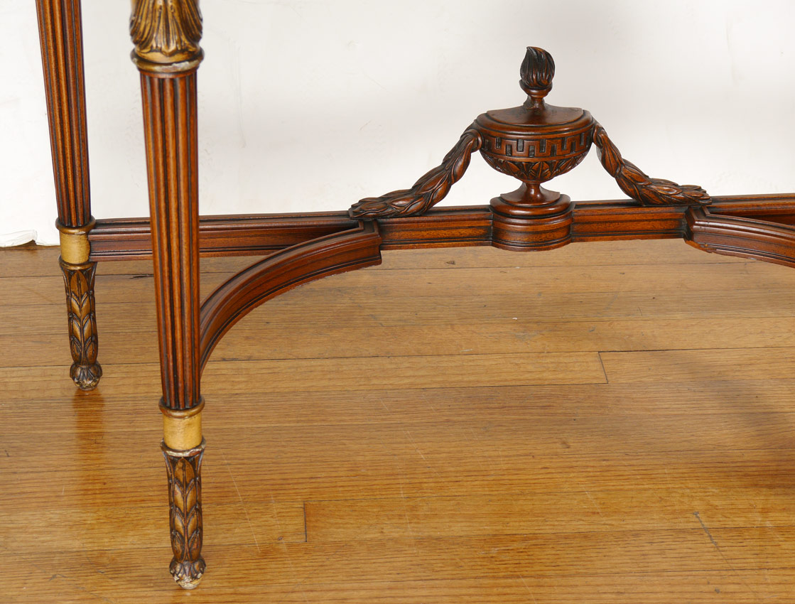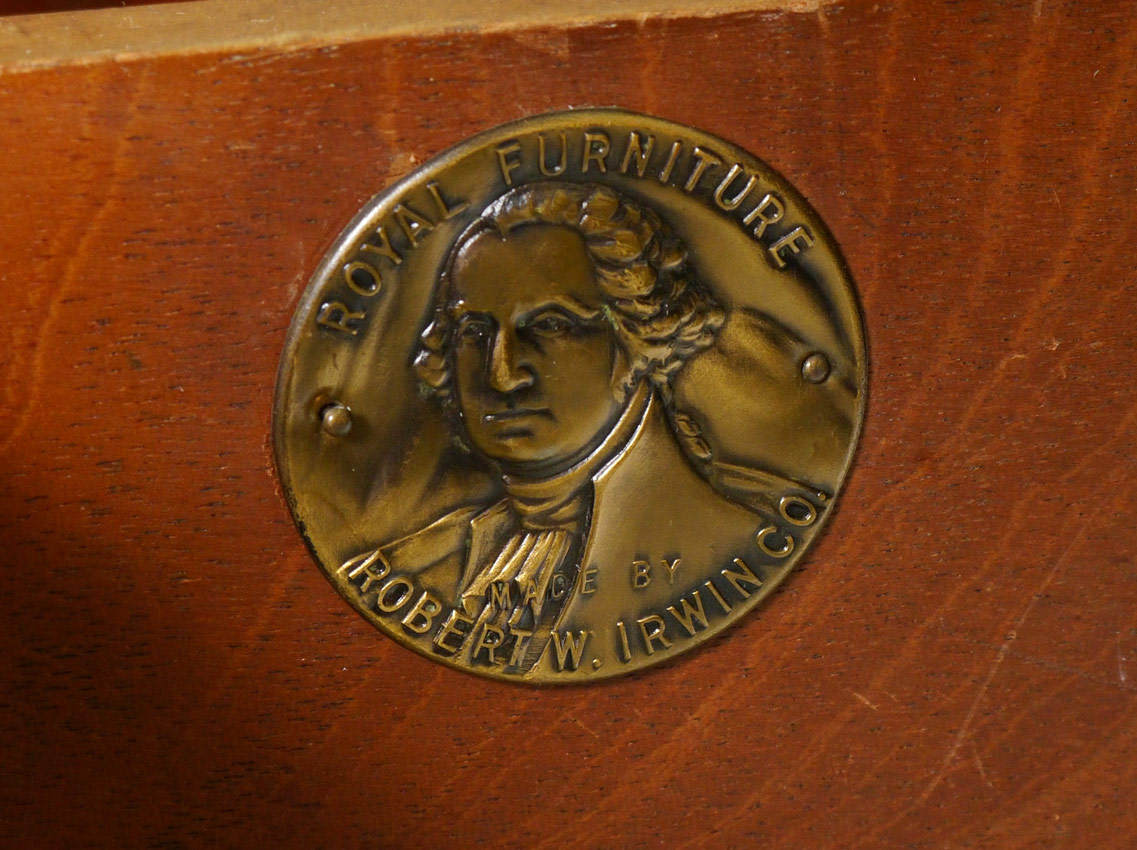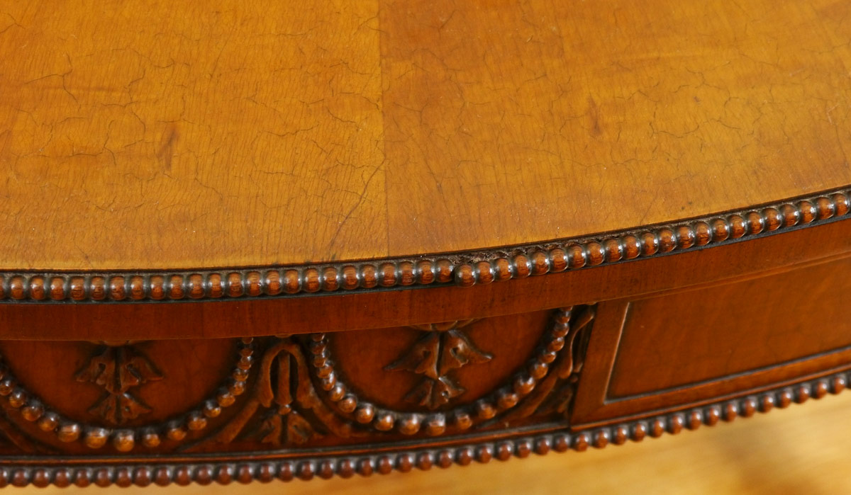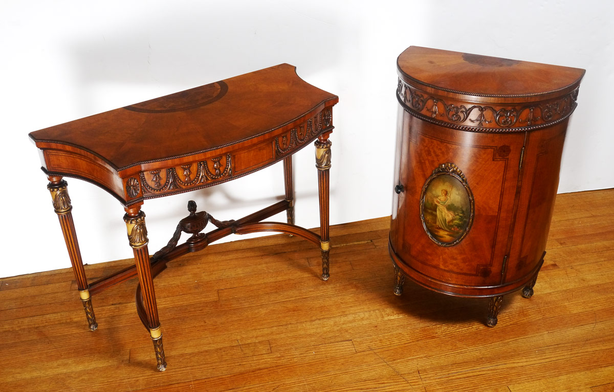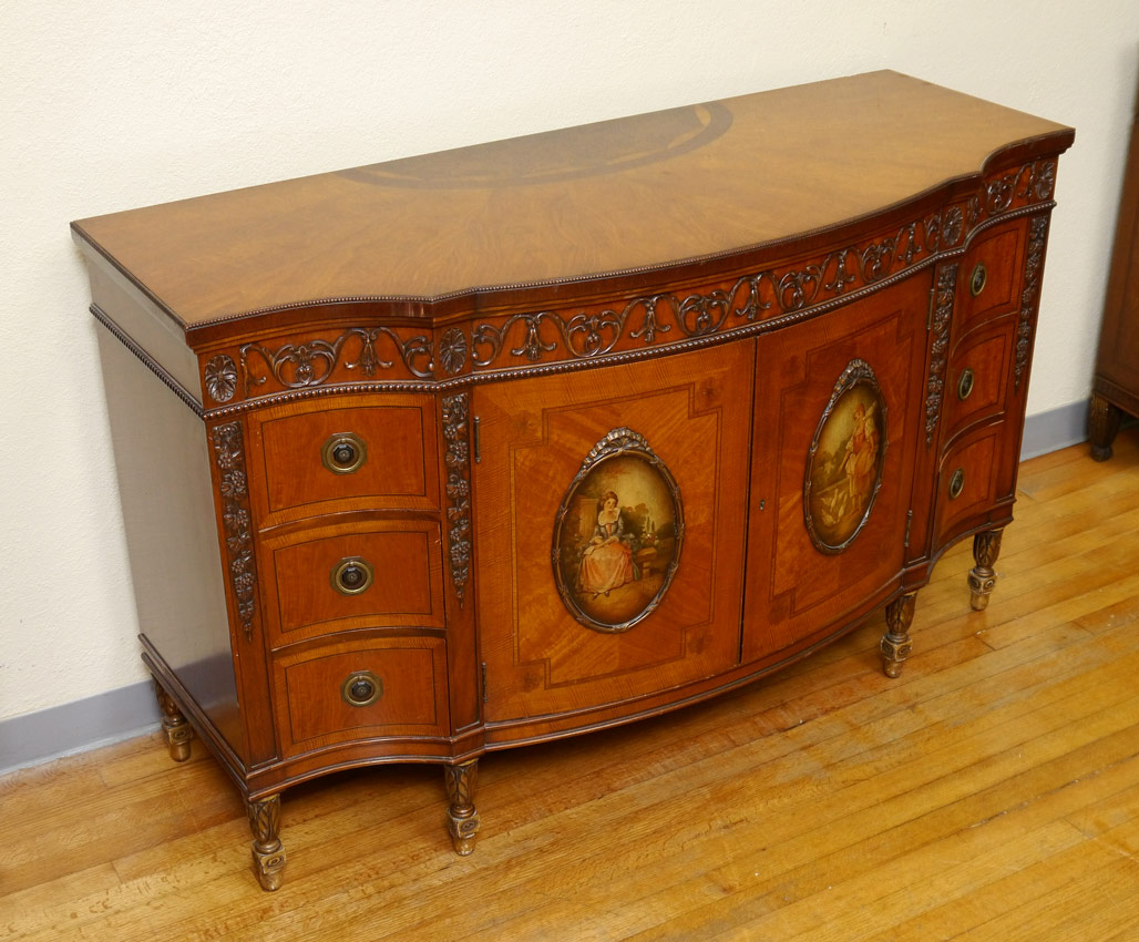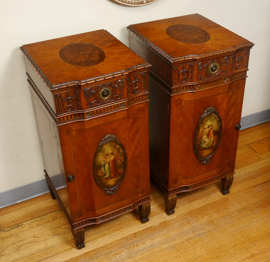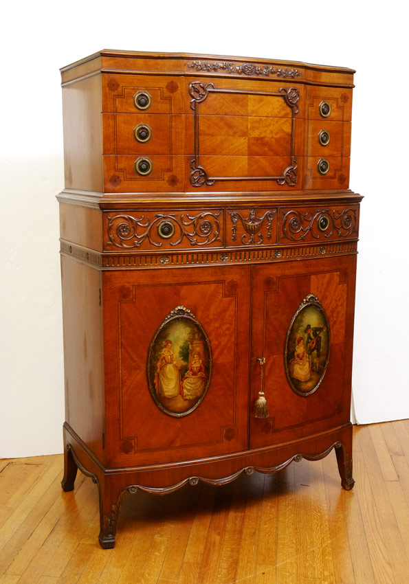 ELEGANT PAINT DECORATED BEDROOM FURNITURE: Circa 1920's by Royal Furniture, Robert Irwin Co. Richly adorned with festoon and fluted carvings with painted panels of young women. Comprising TALL CHEST (60'' h. x 40'' x 20''), curved front DEMI CHEST (35 1/2'' h. x 58 1/4'' x 23''), pair tall STANDS one with glass top (36 1/2'' h. x 17'' x 19''), Vanity TABLE with glass top (28'' h. x 35'' x 17''), small COMMODE (31 3/4'' h. x 20 3/4'' x 13 1/4''), and 2 MIRRORS (oval 58'' x 34 1/2'', rectangular 58 1/2'' x 38 1/2'').