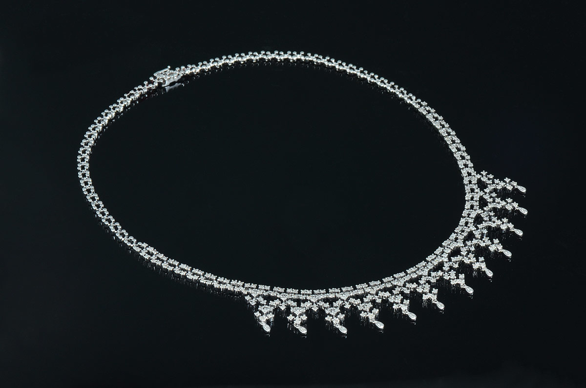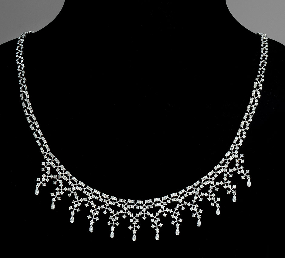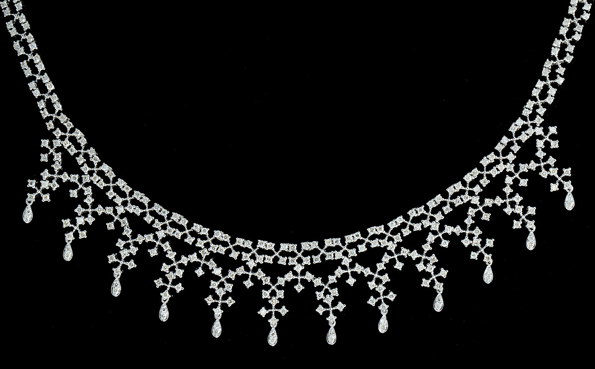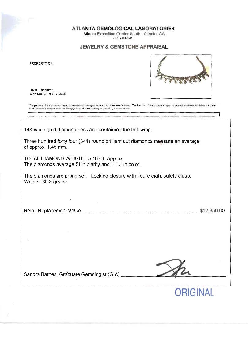 LACY 5.16 CTW DIAMOND NECKLACE: 14K white gold necklace of 344 round brilliant diamonds totaling approx. 5.16 Ct., averaging SI in clarity and H-I-J in color. Prong set. Length approx. 15''. Weight 30.3 grams. Sold with current Atlanta Gemological GIA graduates appraisal for $12,350.