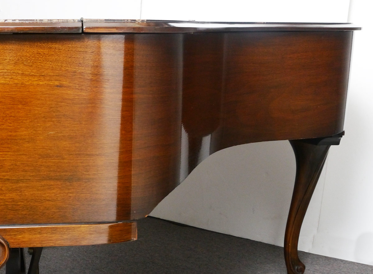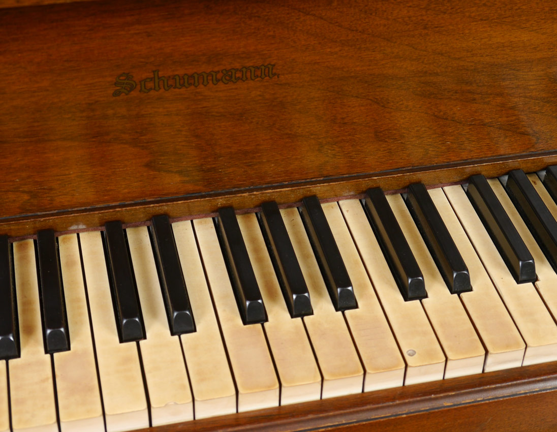 SCHUMANN PETITE GRAND PIANO: Solid wood case on 3 diminutive carved & shaped legs for a piano. Marked with Schumann decal on key cover. Measures 38'' h. x 55'' w. x 53'' l. Sold with piano bench 19'' h. x 34'' x 14''. Doris Baker-Mansergh Estate