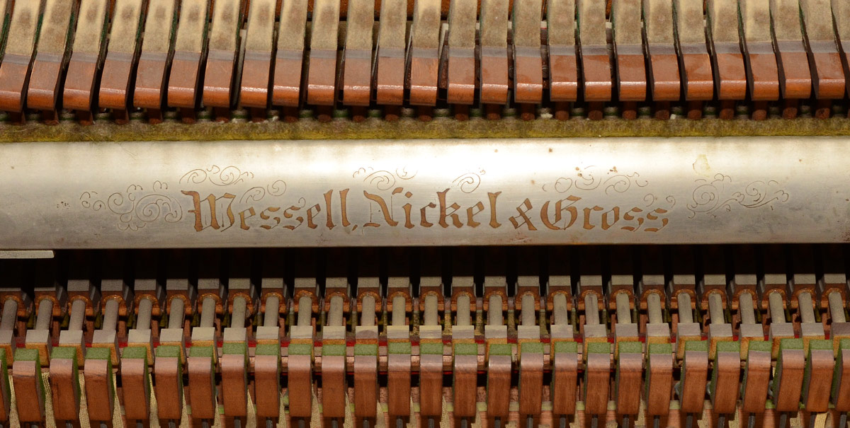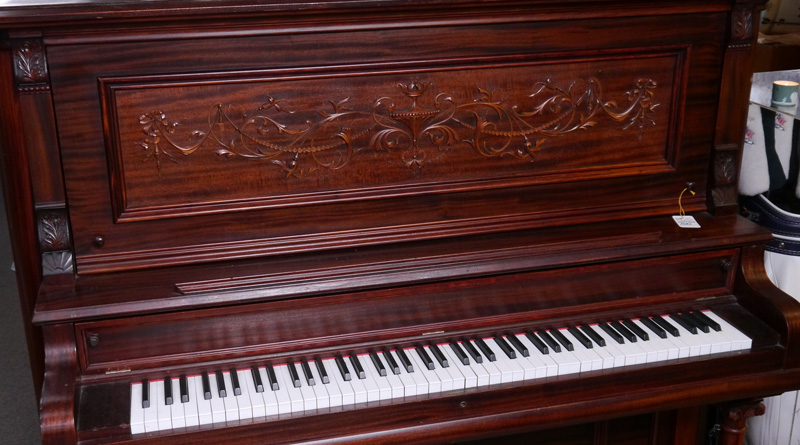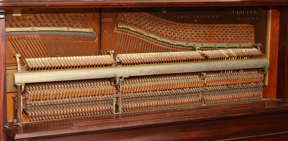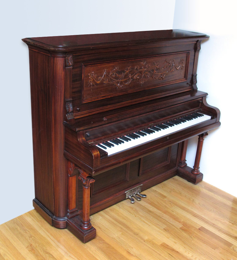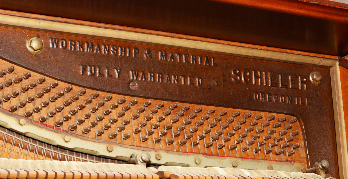MAHOGANY 1904 SCHILLER UPRIGHT GRAND PIANO: Mahogany case with carved panel decoration to top door with urn and floral garland motif. Carved and tuned full column legs, framed panels on bottom door. Marked ''Workmanship & Material Fully Warranted, Schiller , Oregon, Ill'' on soundboard, serial number 21433, dates to 1904. Overall measures 58 1/4'' x 67 3/4'' x 28 1/4''.