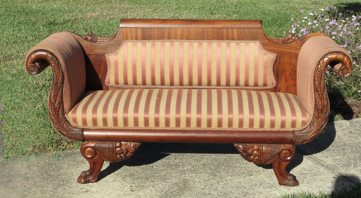 FEDERAL CARVED MAHOGANY SOFA: Carved acanthus leaves to the scrolled arms, straight crest rail and skirt, carved legs and paw feet. Measures approx. 69'' long x 24'' x 30''.