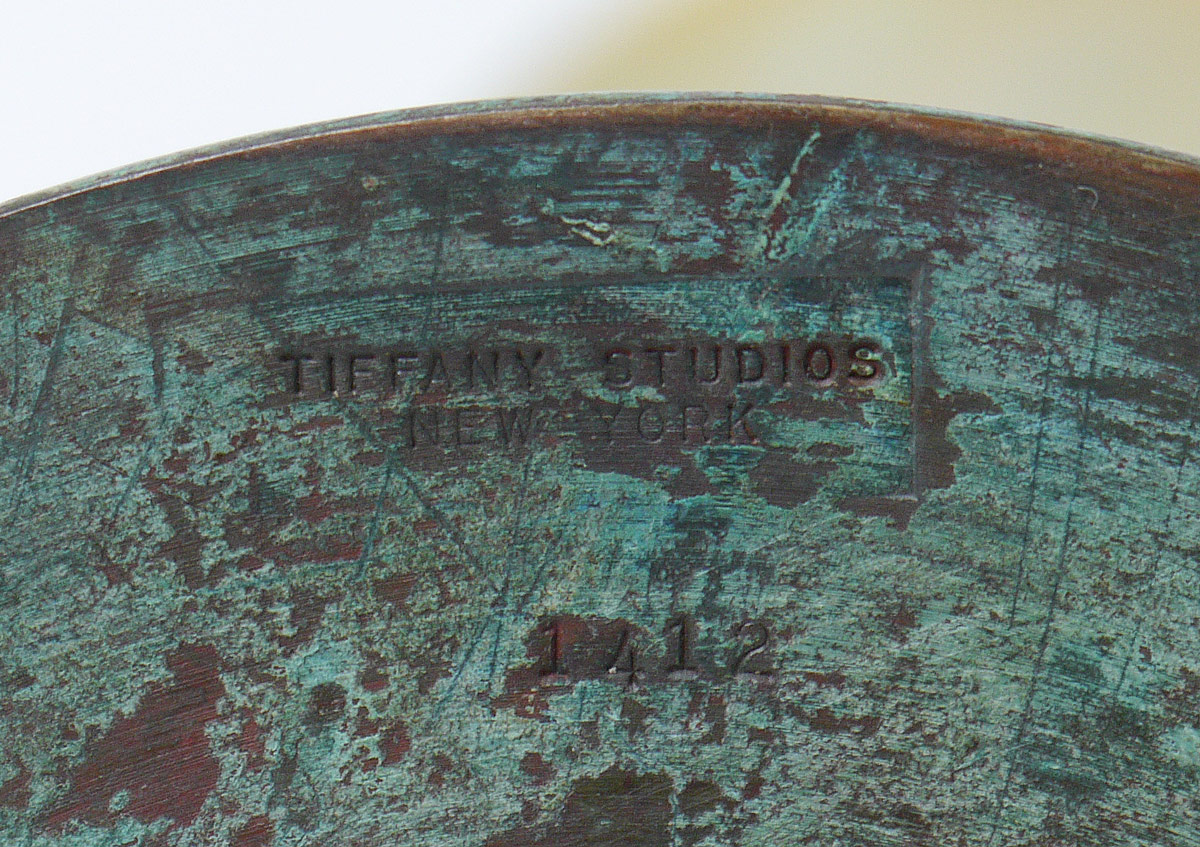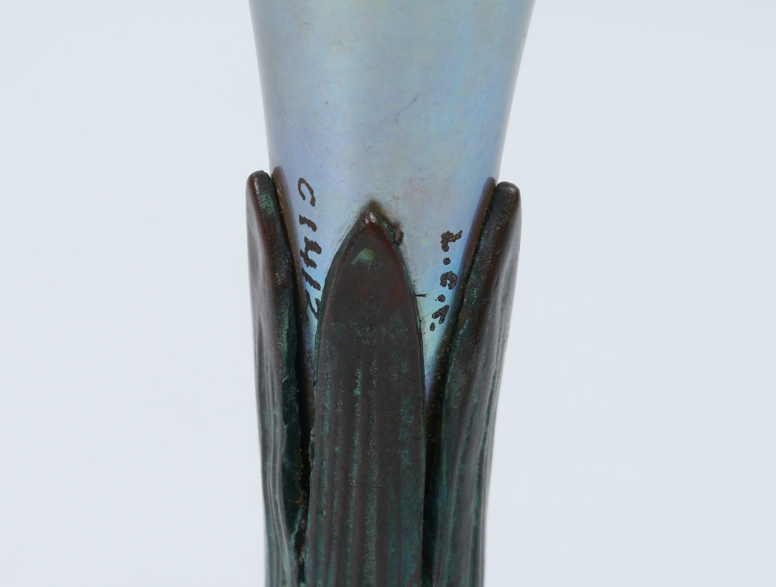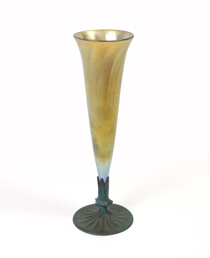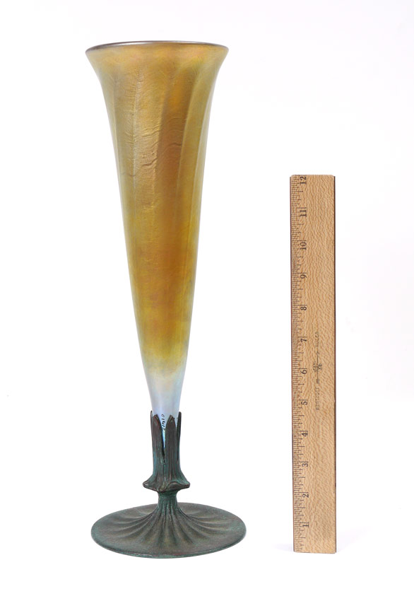 TIFFANY STUDIOS FAVRILE GLASS VASE: 16'' tall Favrile glass mounted in bronze base. The base is signed Tiffany Studios New York 1412, the glass is also numbered C1412. The base measures 5'' dia.