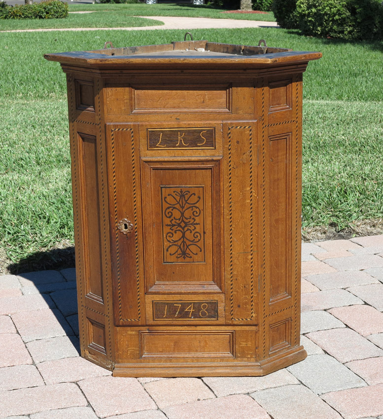 EARLY WALL MOUNT CORNER CABINET: Inlaid decoration with initials LKS and date of 1748. 34'' h. x 28 3/8'' x 17 1/2''.