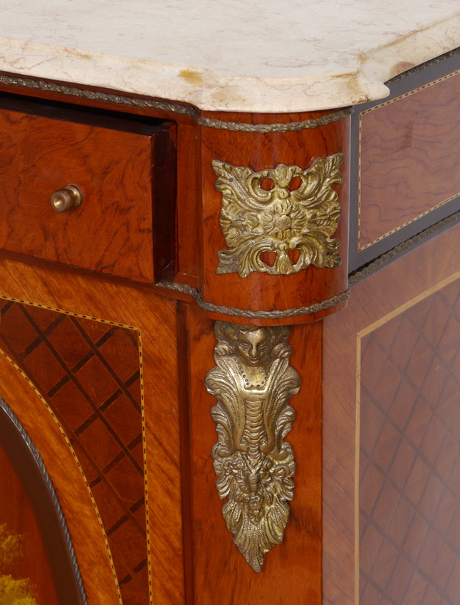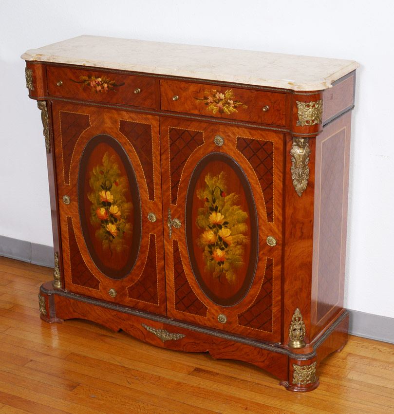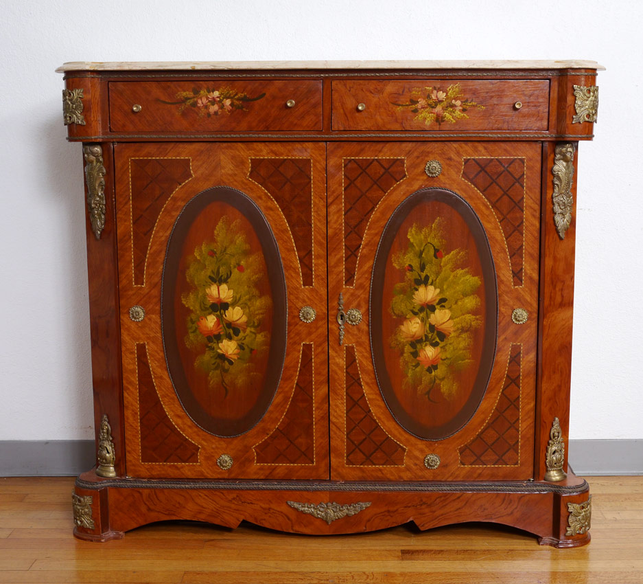 FRENCH EMPIRE STYLE MARBLE TOP PAINT DECORATED SIDE CABINET: Pink molded and shaped marble top with cookie corners, ormolu mounted canted corners, 2 paint decorated drawers over 2 paint decorated and inlaid doors, internal shelf. 42 1/2'' h. x 47'' x 16 1/2''.